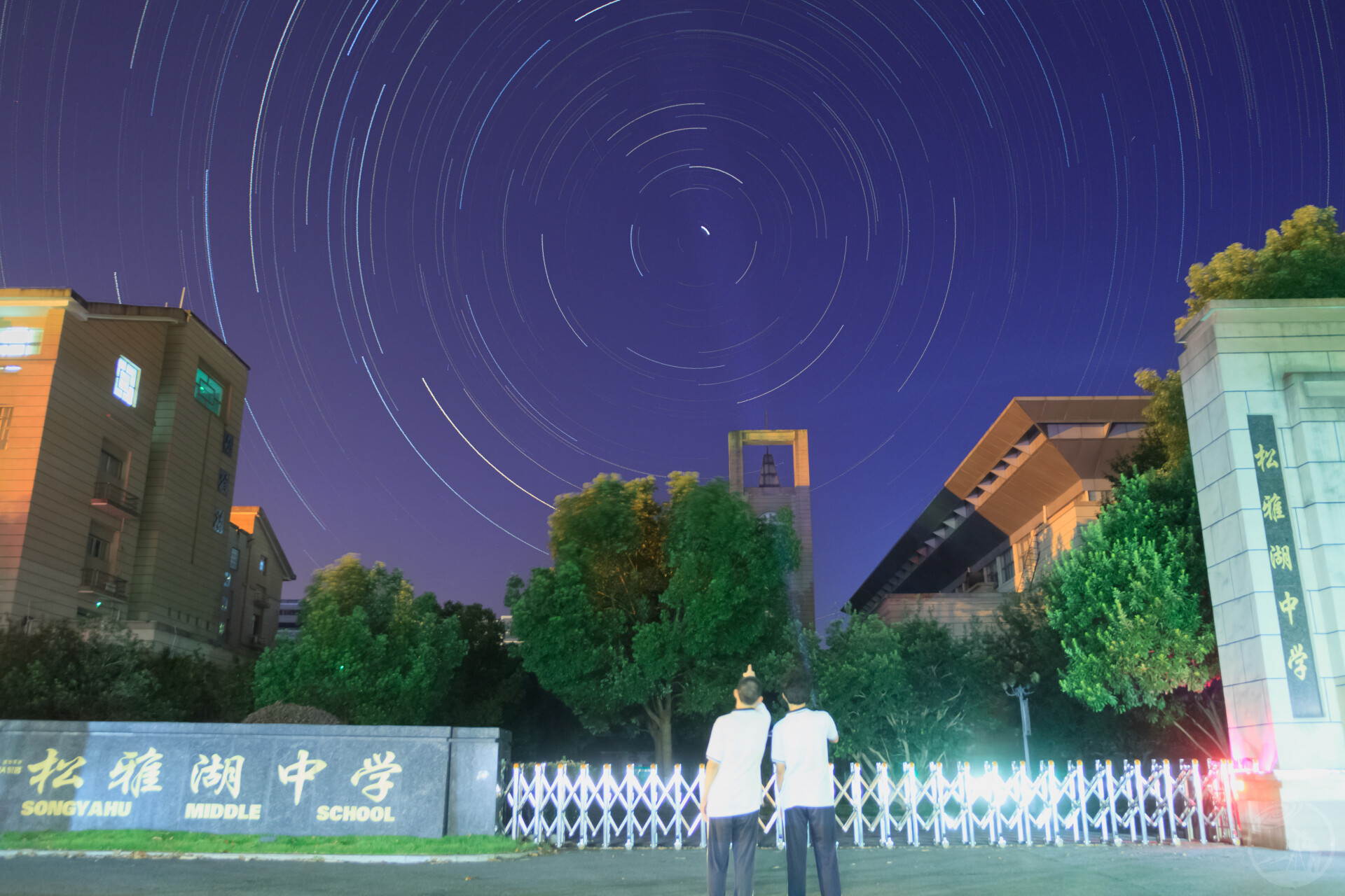 当我看到一张张星轨照片时被深深震撼了,我也想利用手头仅有的器材拍出绚丽的星轨。我很快就想到了我的学校,决定在南门拍摄一晚。然而,父母总是说晚上别出去,有各种坏人出没,认为我疯了。可是我真的觉得这次机会于我而言非常重要,总是反驳他们:“不入虎穴,焉得虎子。”