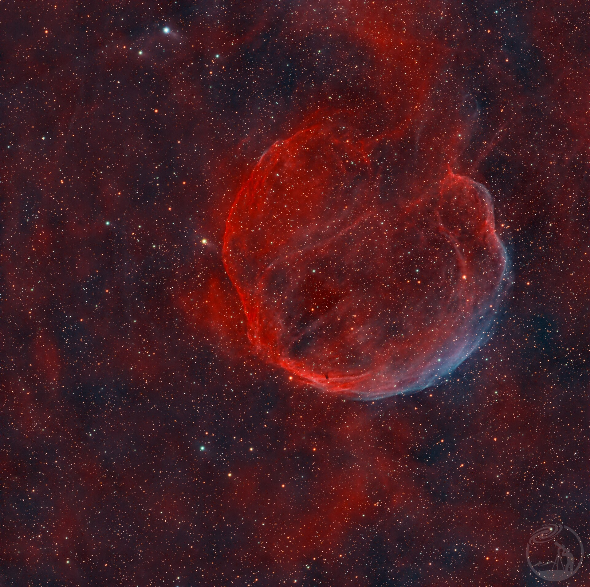 位于仙后座的超新星遗迹——延髓星云,别名宇宙大石榴,编号Abell85、CTB-1、LBN576,是约一万年前一颗大质量恒星爆炸时留下的膨胀气体壳。Ha和OIII通道各曝光15小时,拍摄时间从2023年5月19日走走停停到2024年10月1日,拍摄成本近2k,但最终出图的那一刻,感觉一切都值得,不负自己对星空的热爱。非常感谢趣拍星和趣拍精灵的设备与技术支持。