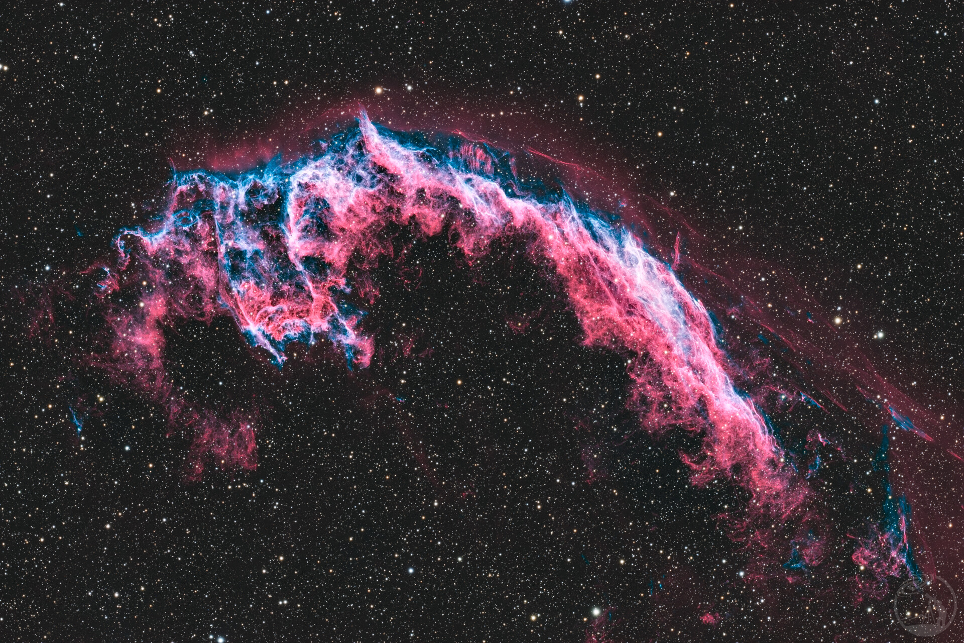 连续的晴夜下顺利拿到接近30小时的窄带数据,叠加后的信噪比很高,简单处理后发现这个天区恒星非常密集,因此做了星点遮罩,上传一个缩星的版本。