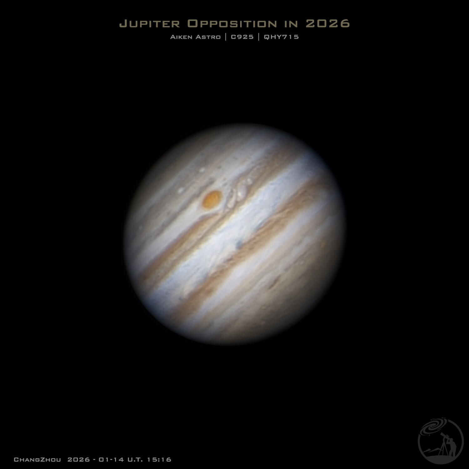 2026年首次拍摄,当日观测条件良好,气温为19摄氏度,视宁度达到江浙沪地区近期最优水平,成像清晰度显著提升,成功实现精确对焦。拍摄过程中天空出现少量薄云,短暂影响通光率,但未完全遮挡目标天体。期间捕捉到木星大红斑的影像,该特征位于木星南半球,呈椭圆形暗红色斑块,边缘清晰,与周围云带形成明显对比,结构稳定,可见其内部细微纹理及周边涡旋状云系分布。