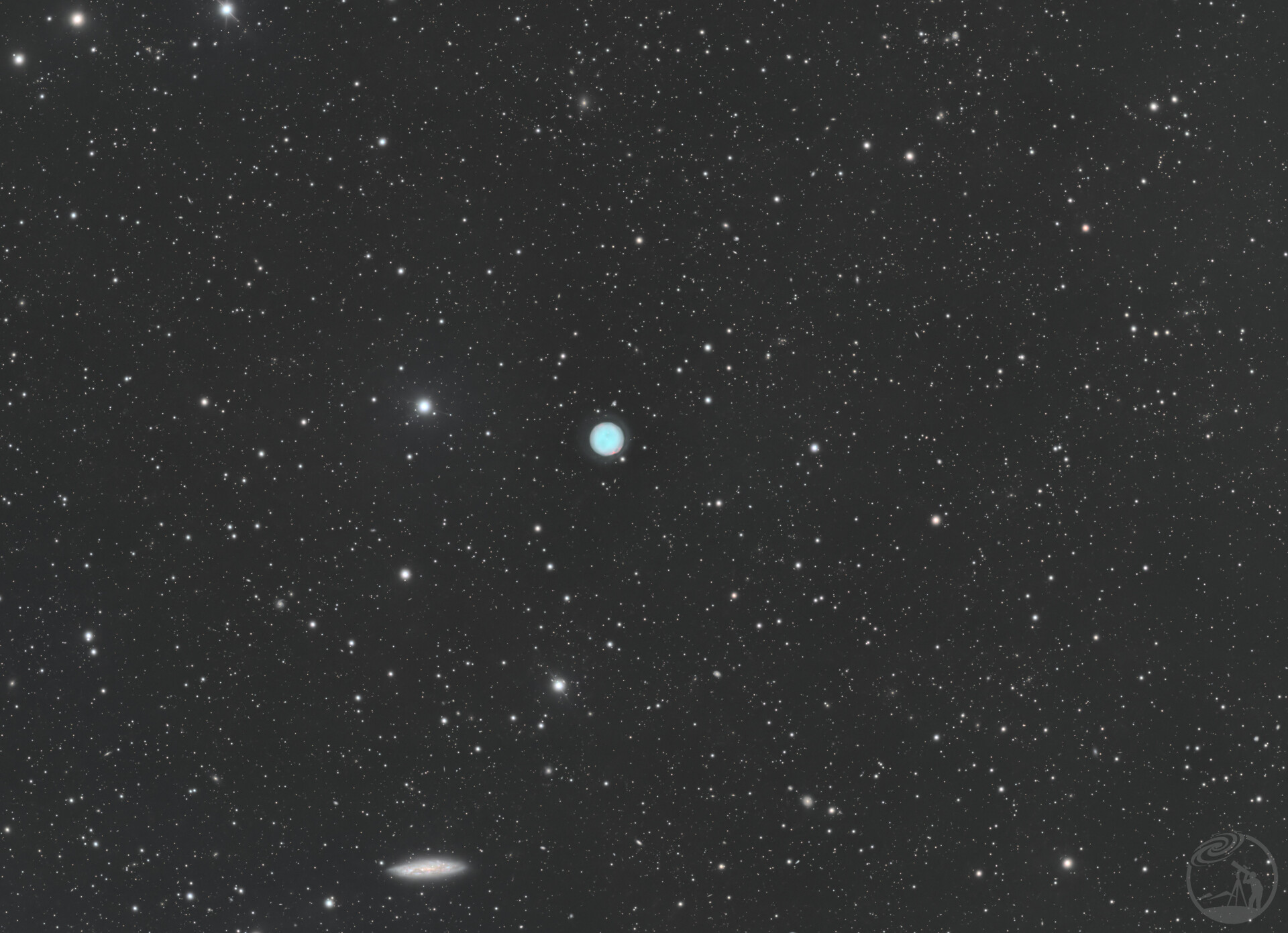 画面正中央为夜枭星云(Messier 97),这是一个行星状星云。在视觉上,该天体呈现出清晰的圆形轮廓,整体辐射出淡青色与蓝绿色的光辉。星云内部结构显示出不均匀的亮度分布,中心区域存在两个较暗的斑块,这是该星云标志性的形态特征。星云边缘的光晕较为柔和,向外围逐渐过渡至背景天空。