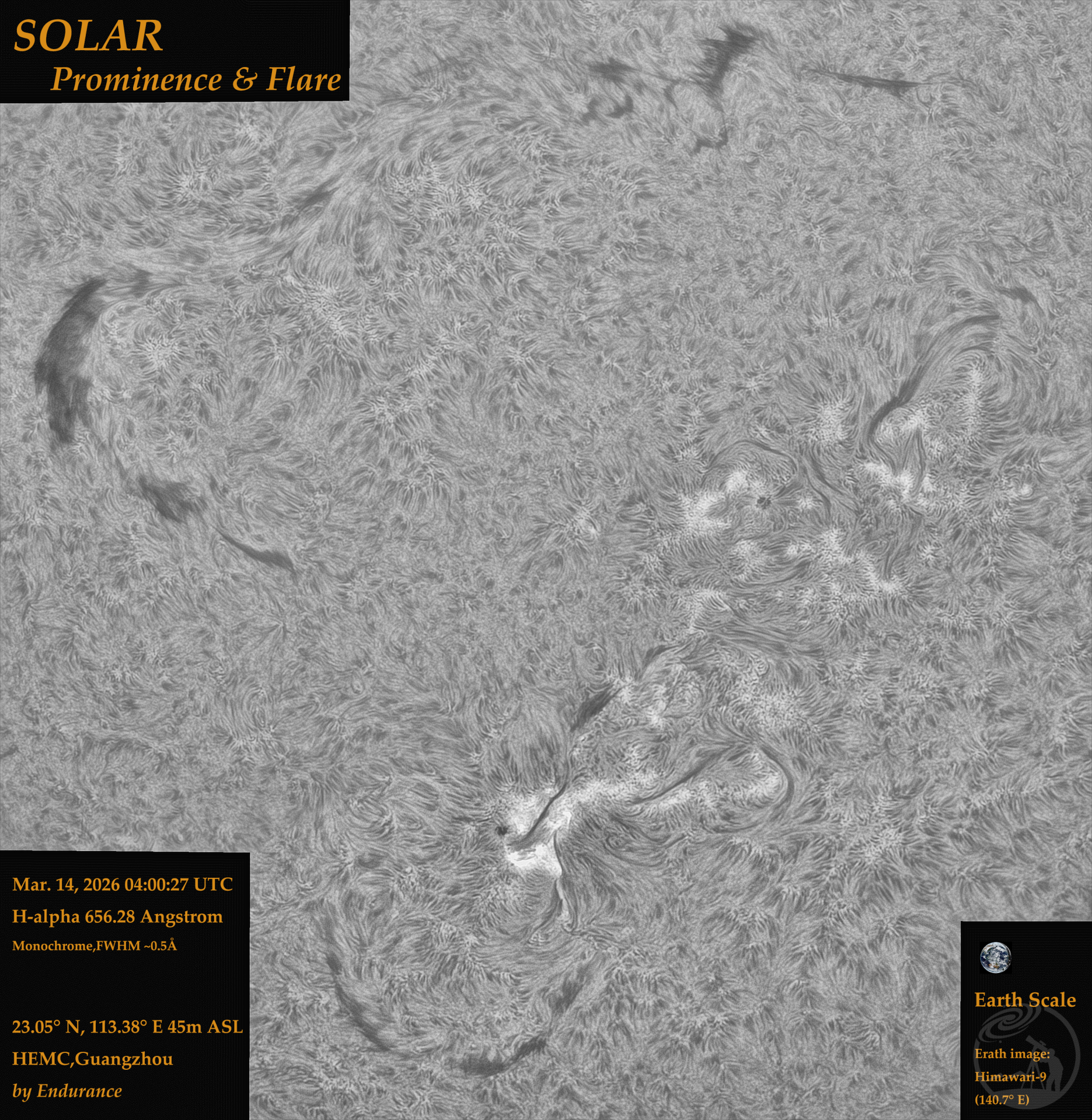 看多了彩色的审美疲劳,来点黑白的看看 所示地球影像与色球层影像拍摄时间一致