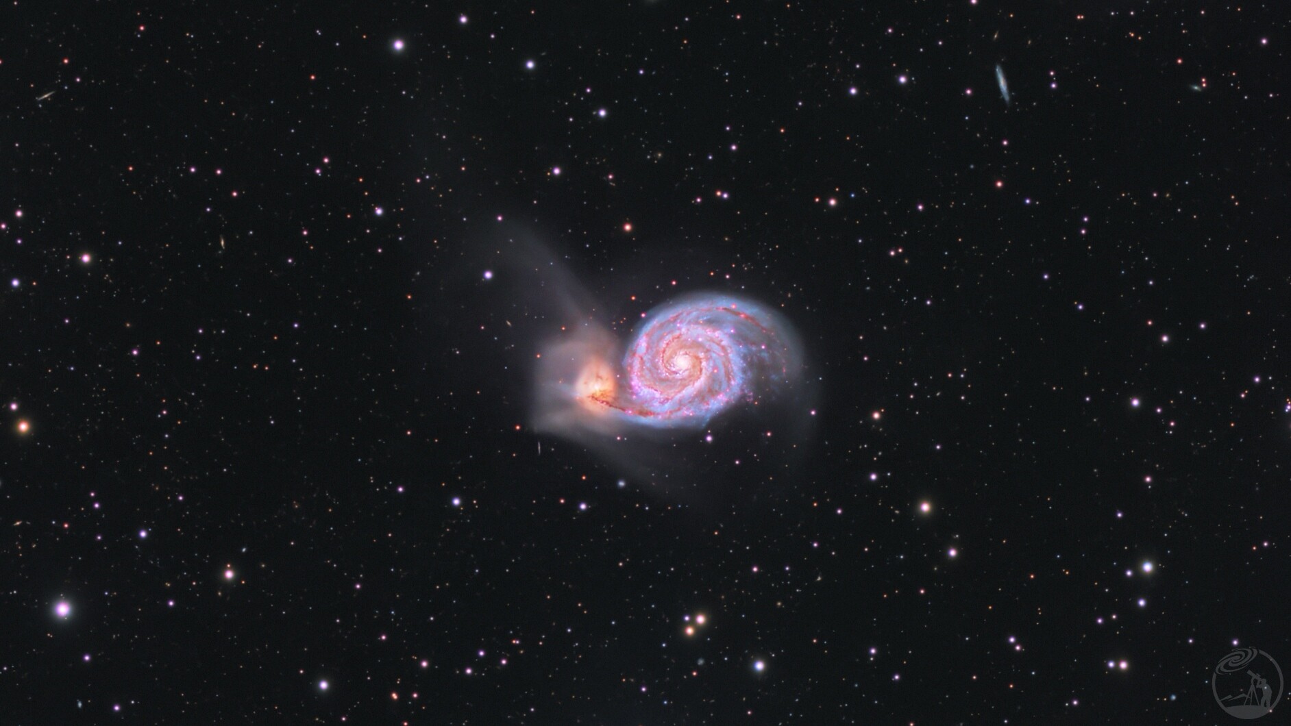 M51 旋涡星系:宇宙中的完美螺旋这张照片拍摄的是著名的 M51 旋涡星系,位于猎犬座,距离地球约 3100 万光年。M51 是天空中最壮观的螺旋星系之一,直径约 7.6 万光年。它的旋臂清晰优美,蓝色区域是年轻炽热的恒星,红色区域则是活跃的恒星形成区和 Hα 发射线。星系右侧的小亮点是 NGC 5195,一个正在与 M51 相互作用的矮星系——正是这种引力作用塑造了 M51 标志性的螺旋结构。通过 23小时的累计曝光(LRGBH 合成),我捕捉到了星系的精细结构和丰富的色彩层次。L 通道用于增强细节,H 通道突出了恒星形成区的红色发射线。背景中还能看到众多更遥远的星系,展现了宇宙的深邃。当我们凝视 M51,我们看到的不仅是美丽的星系,更是 3100 万年前的光——那时,人类的祖先还在非洲草原上漫步。