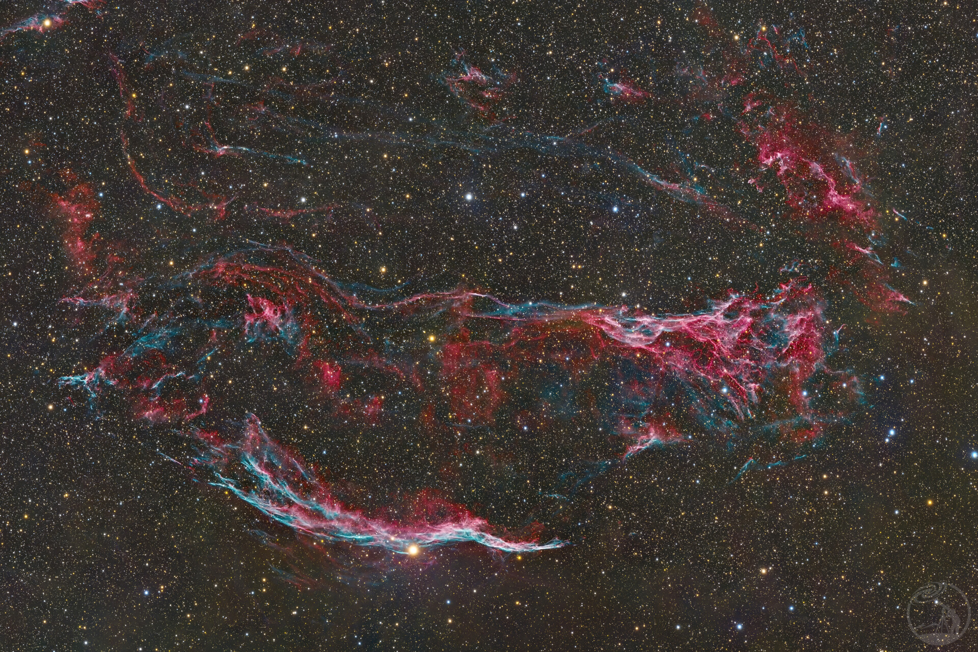 本作品呈现的是位于天鹅座方向的NGC 6960,通称为西面纱星云(Western Veil Nebula)。画面主体展示了星云复杂的丝状和纤维状结构,气体云呈现出稀薄而精细的形态,如同烟雾般在星际空间中延展。在色彩表现上,图像清晰地区分了不同化学元素的发射谱线特征:大面积的深红色与粉色调区域主要对应电离氢(H-alpha)辐射,显示了激波加热气体的分布;而交织其中、勾勒出发光边缘的青蓝色细丝则主要源自双电离氧(O-III)辐射。