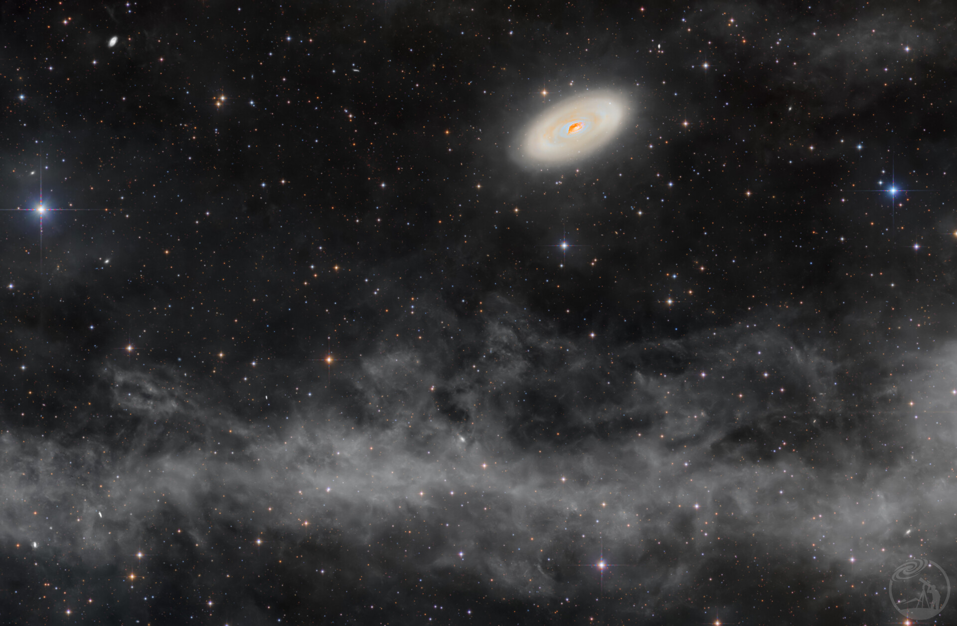 位于后发座(Coma Berenices)的螺旋星系M64俗称“黑眼星系”(Black Eye Galaxy)。画面主体位于右上方,清晰展示了该星系的漩涡结构。星系核心区域明亮且致密,呈现出由年老恒星构成的暖黄色调,向外逐渐过渡为较暗的旋臂结构。在核心前方,一条显著且厚重的暗尘埃带横跨而过,这是M64最显著的形态特征。这条尘埃带由吸光的星际物质组成,在明亮的星系背景衬托下形成了强烈的明暗对比,如同星系的一只“黑眼圈”,清晰地勾勒出星系盘面的倾斜角度。