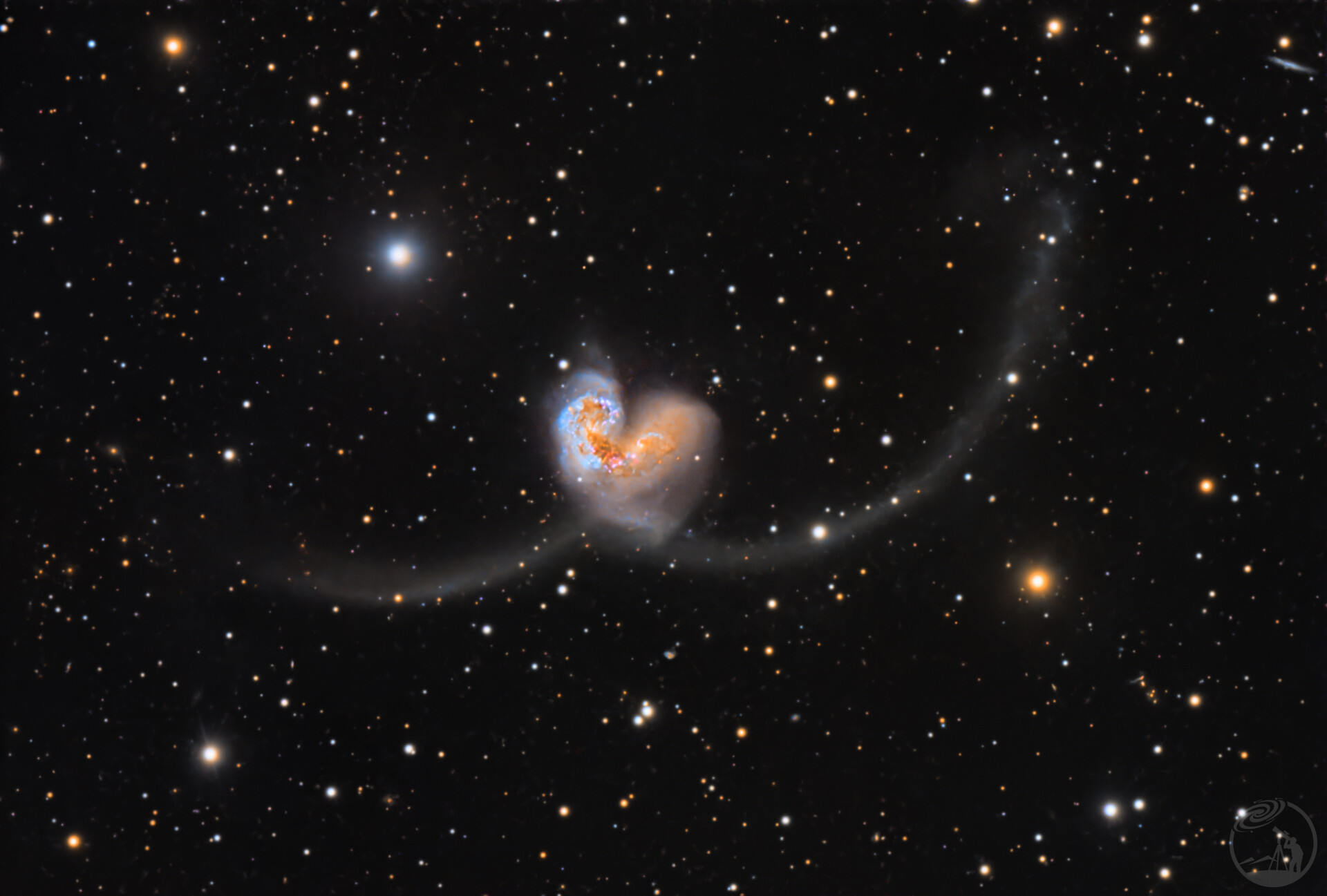 NGC4038与NGC4039距离地球约6500万光年,是两个正在合并的星系,它们的核心被潮汐力拉出两条由恒星与气体构成的长尾,形似一颗宇宙最大的爱心。