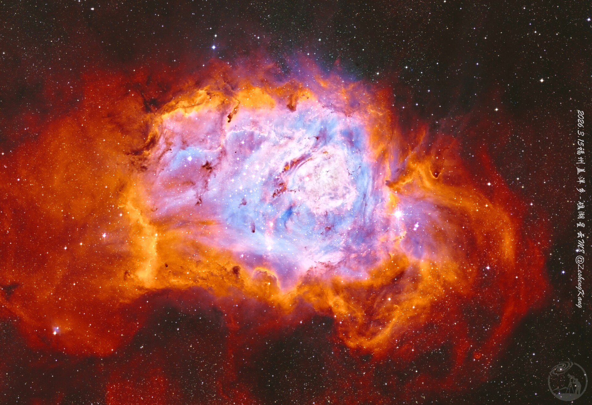 本作品呈现的是梅西耶天体M8,即礁湖星云(Lagoon Nebula)。该天体位于人马座方向,是一个巨大的发射星云及活跃的恒星形成区。