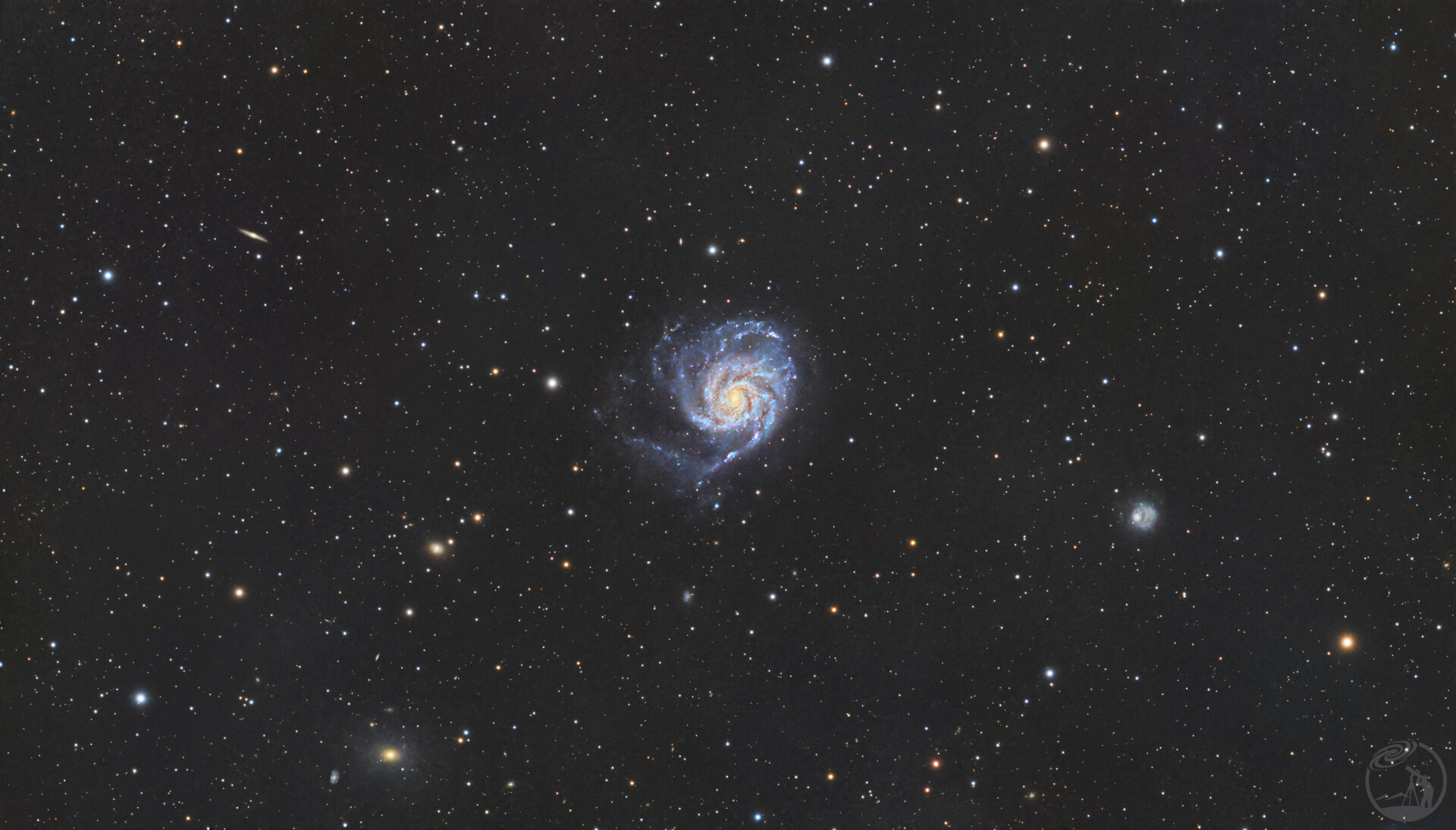 在M101主星系的周围,分布着若干伴星系及背景天体。画面右下方可见一个较小的旋涡星系(可能是其伴星系NGC 5474),左上方则有一个侧向面对的星系(可能是NGC 5473),左下方亦可见一个椭圆状星系。整个视场背景布满了密度极高的前景恒星,这些恒星亮度不一,色彩涵盖了蓝白、黄、橙等多种光谱类型,与深黑色的宇宙背景形成对比,突显了深空天体的细节与色彩特征。