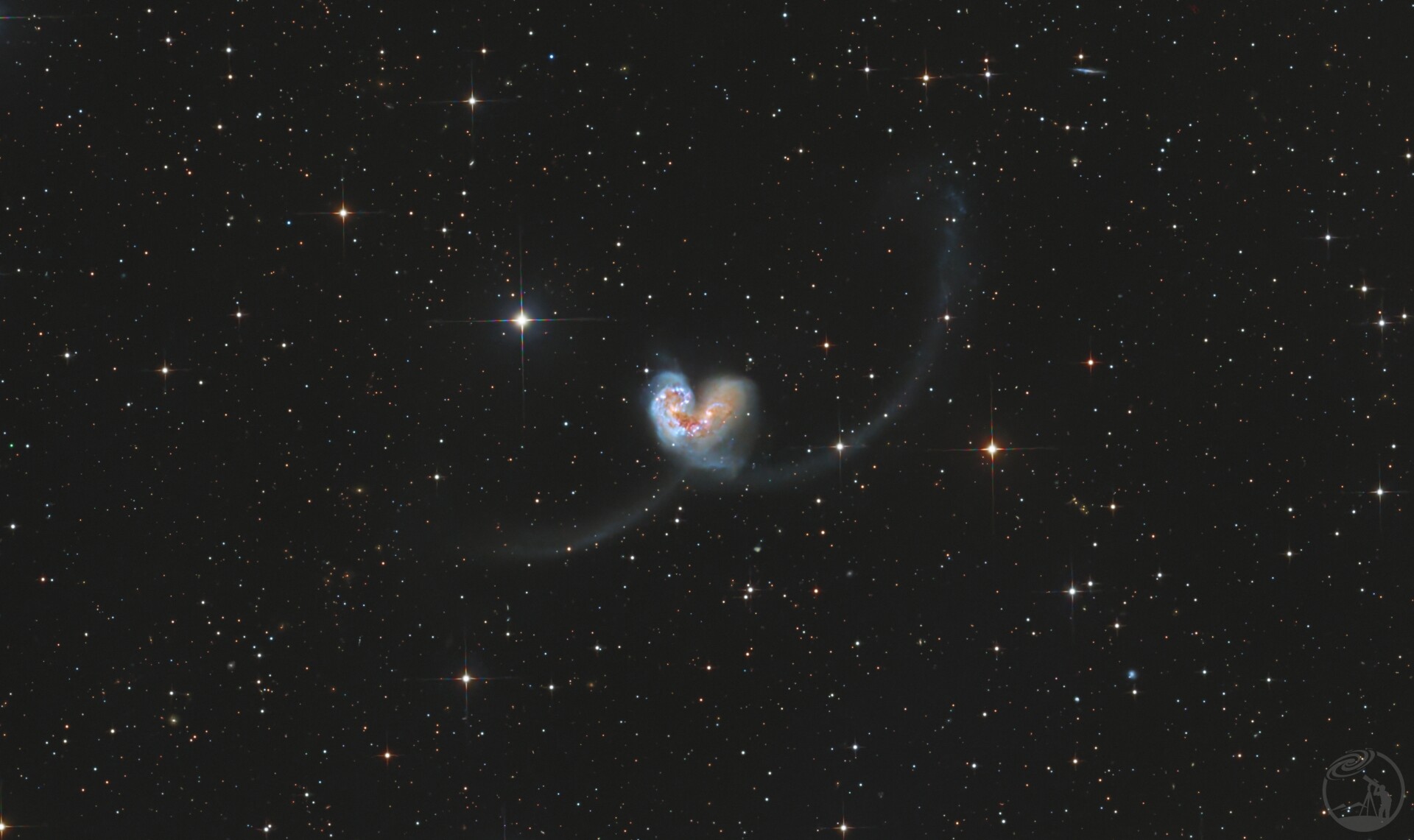 在视觉结构上,两个星系的核心区域紧密相邻,呈现出明亮的橙黄色与红褐色调,这主要对应于星系中心密集的老年恒星群以及尘埃遮蔽区域。从这两个核心向外延伸出两条巨大的、弯曲的潮汐尾,分别向画面的左下方和右上方伸展,构成了类似昆虫触须的形态,这也是该天体名称的由来。这些潮汐尾结构呈现出明显的青蓝色调,表明其中包含大量由引力扰动触发形成的年轻、高温恒星以及电离氢区。