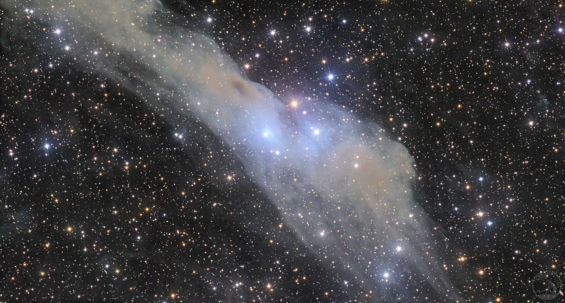 本作品呈现了位于天鹅座(Cygnus)方向的反射星云LBN 534。画面主体为一片呈对角线分布的星际尘埃云,从左上角向右下角延伸。该星云主要由星际尘埃组成,通过散射附近年轻、炽热恒星的蓝光而发光,因此在视觉上呈现出明显的淡蓝色调,边缘及较厚区域则过渡为灰白色或浅褐色。