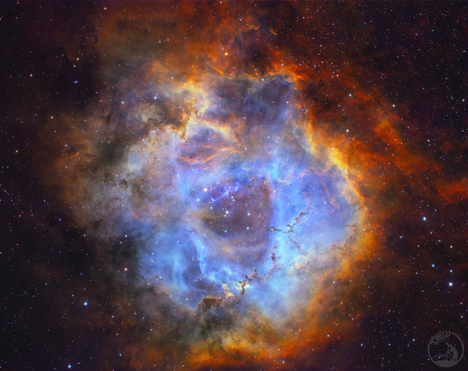 本作品呈现的是位于麒麟座方向的发射星云NGC 2237,通称为玫瑰星云。画面主体为一个巨大的电离氢区(H II region),其中心包含疏散星团NGC 2244。该星团由多颗年轻的高温恒星组成,它们发出的强烈紫外辐射电离了周围的气体云,导致星云发光。