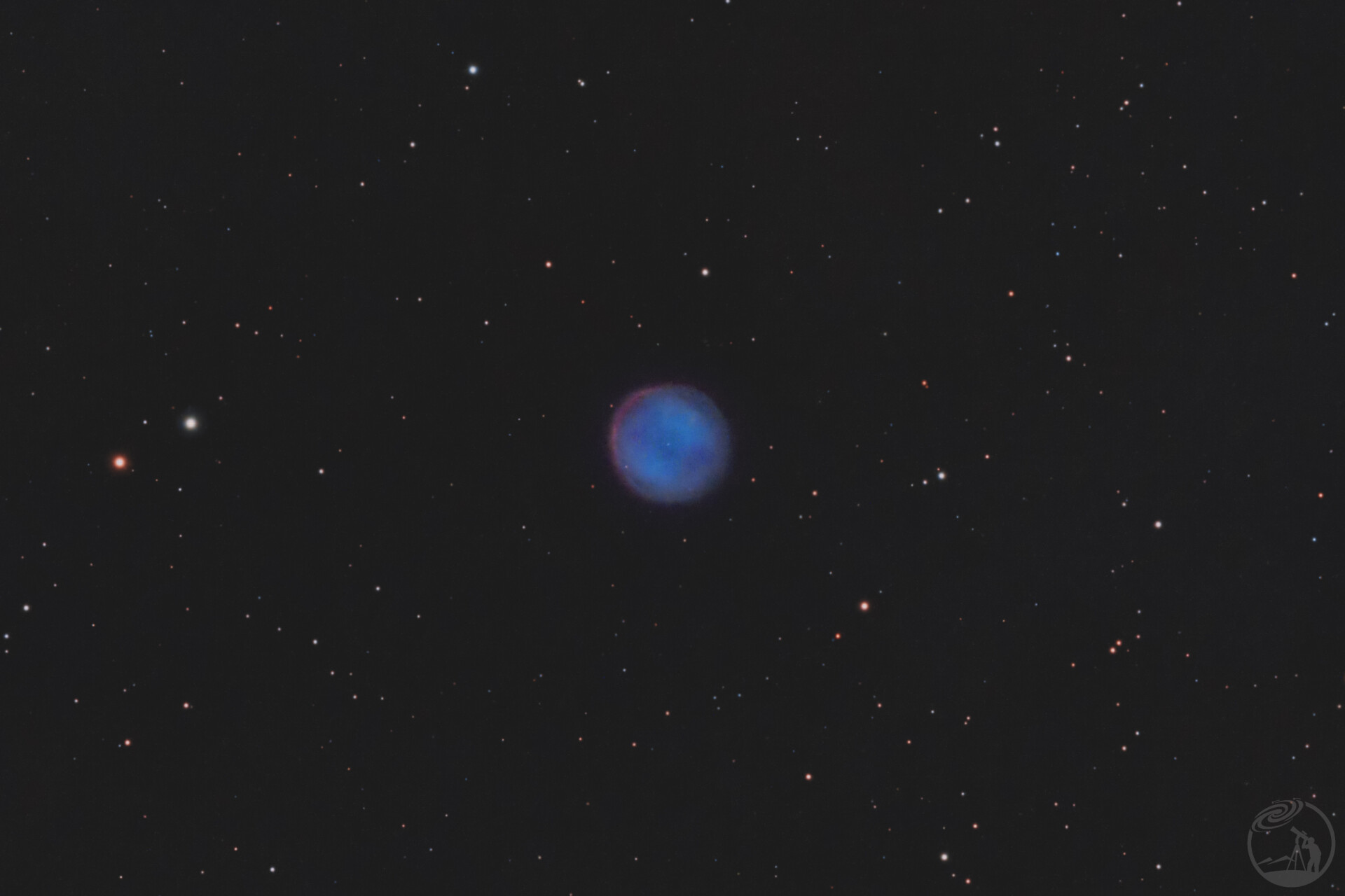 南夜枭星云pk283+25.1,也叫南猫头鹰星云,是位于长蛇座的行星状星云,其名称源于与北天猫头鹰星云M97相似的对称性形态特征 。该天体表现为具有对称结构的蓝色圆盘,直径约4光年,距离地球约3500光年。