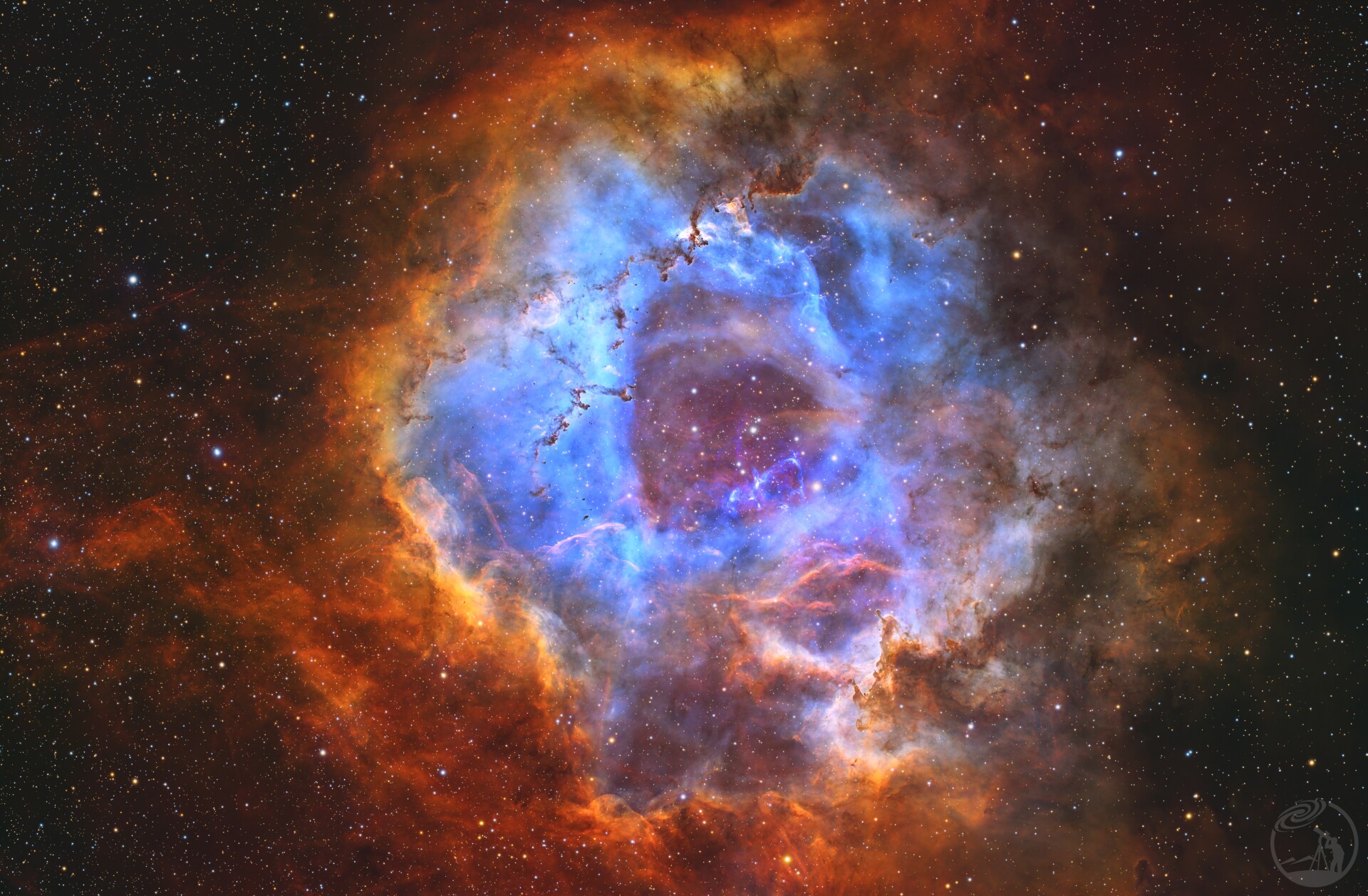 该图像展示的是位于麒麟座(Monoceros)的玫瑰星云(Rosette Nebula),其主体发射星云编号为NGC 2237。这是一个典型的H II区,即恒星形成区。画面中心清晰可见疏散星团NGC 2244,该星团由大量年轻、大质量的O型和B型恒星组成。这些恒星发出的强烈紫外辐射电离了周围的气体,同时其恒星风在星云中心吹出了一个明显的空腔结构。