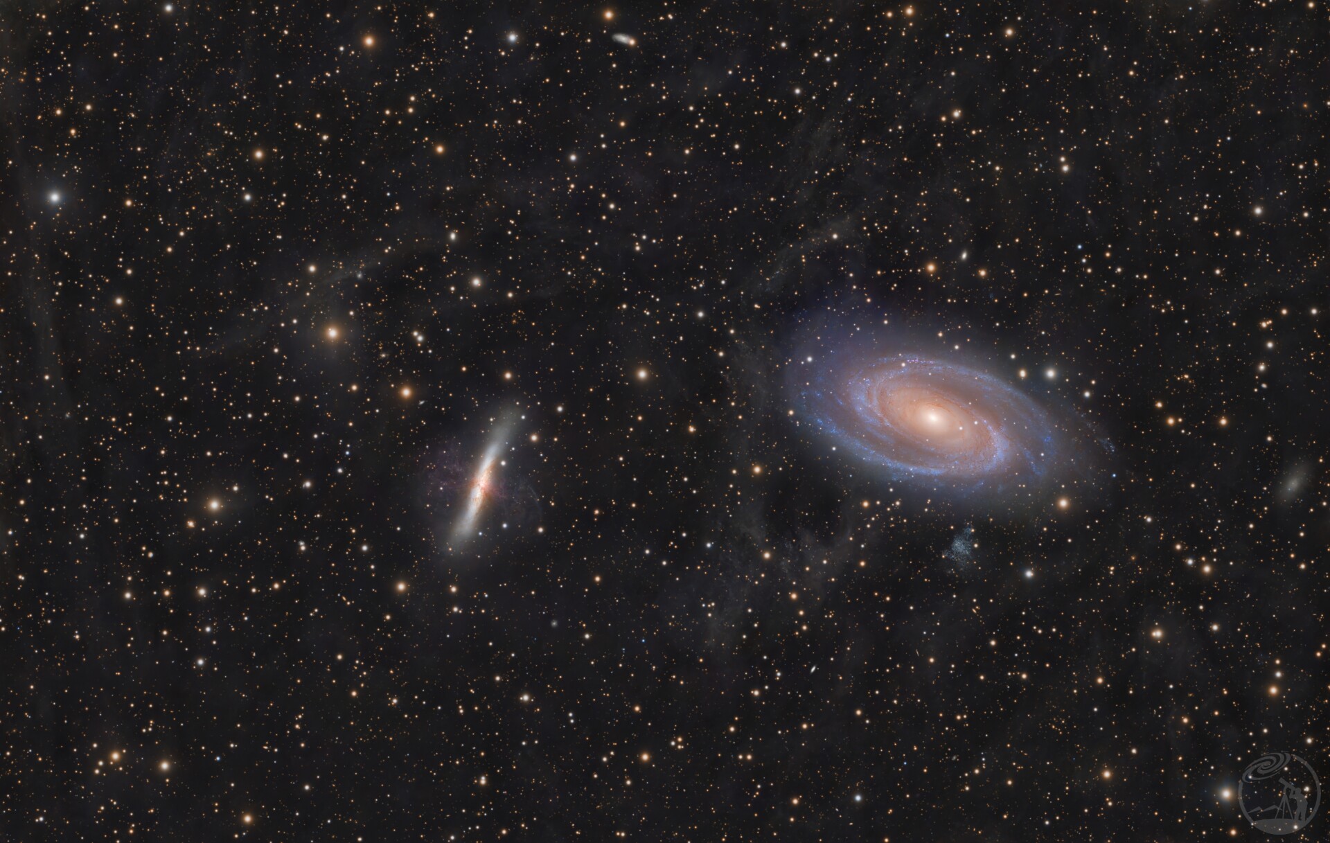 本作品展示了位于大熊座天区内的著名星系对:M81(波德星系)与M82(雪茄星系)。
