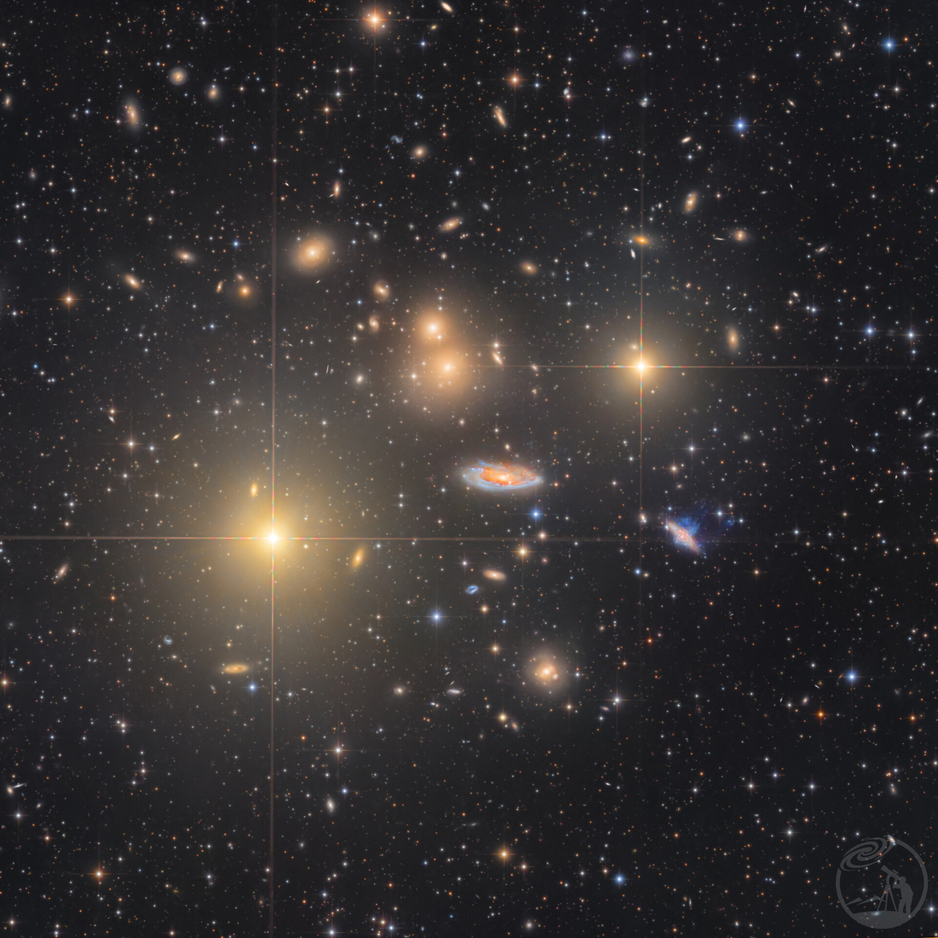 位于长蛇座的星系团,几乎被这颗超亮的恒星光晕遮蔽了,这还是削弱光晕的版本,原版几乎把星系颜色吃掉了