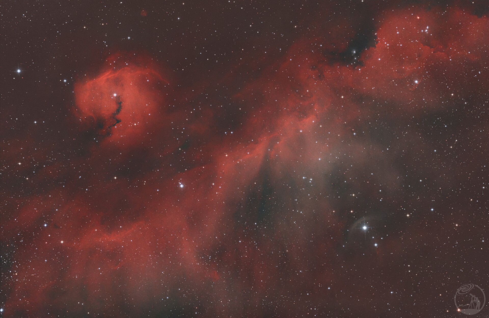 海鸥星云(含IC 2177、NGC 2327、Sh2-296)位于麒麟座与大犬座交界处,是一处距离地球约3800光年的大型发射星云/恒星形成区,因整体轮廓酷似展翅海鸥得名,主体为电离氢区,受年轻大质量恒星辐射呈现显著红色氢辉光,延展超200光年,内部可见暗尘带、星团与高速恒星形成的弓形激波。