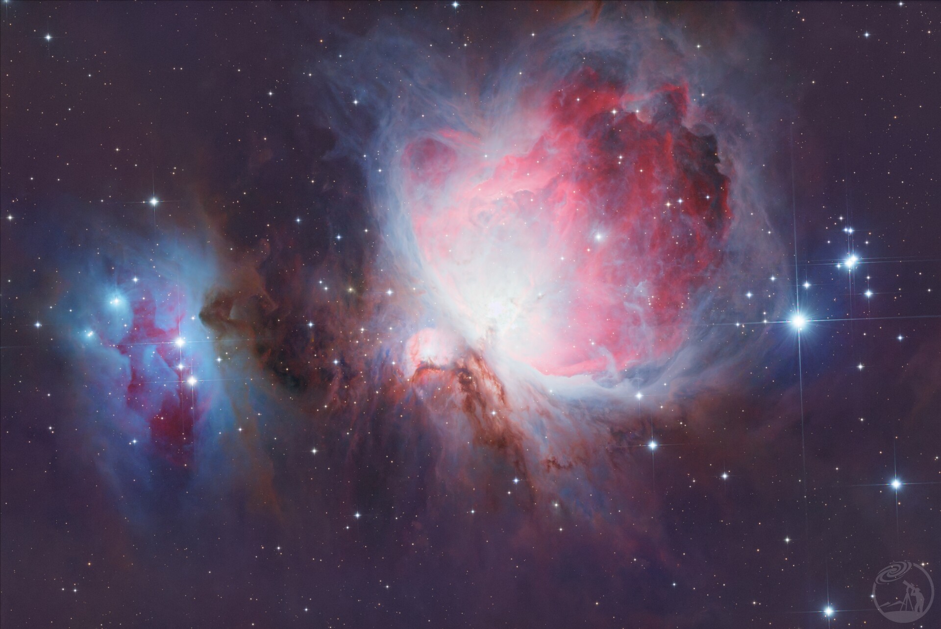猎户腰间,一千三百光年外的星云摇篮。炽热的四合星点亮整片弥漫云气,粉红氢辉与幽蓝反射光交织翻涌,浓密尘埃在光晕中流转,无数恒星正从混沌里破茧而出。它是离我们最近的恒星育婴室,温柔又磅礴,像宇宙在深空里睁开的一只明亮眼眸,静静注视着星河诞生。