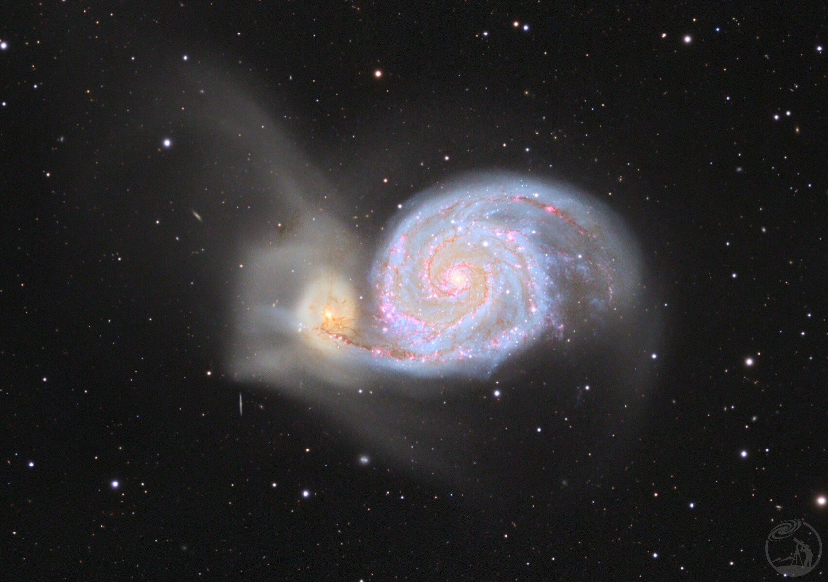 本作品呈现的是位于猎犬座方向的M51星系系统,通常被称为涡状星系。画面主体由两个相互作用的星系组成:右侧较大的螺旋星系M51(NGC 5194)和左侧较小的伴星系NGC 5195。