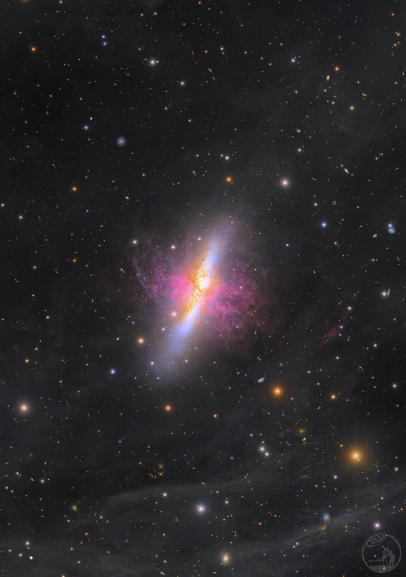 这幅图像主要展示了位于大熊座的两个著名深空天体:NGC 3031(梅西耶81,M81)与 NGC 3034(梅西耶82,M82)。这两个星系在引力作用下构成了一个紧密的星系群。