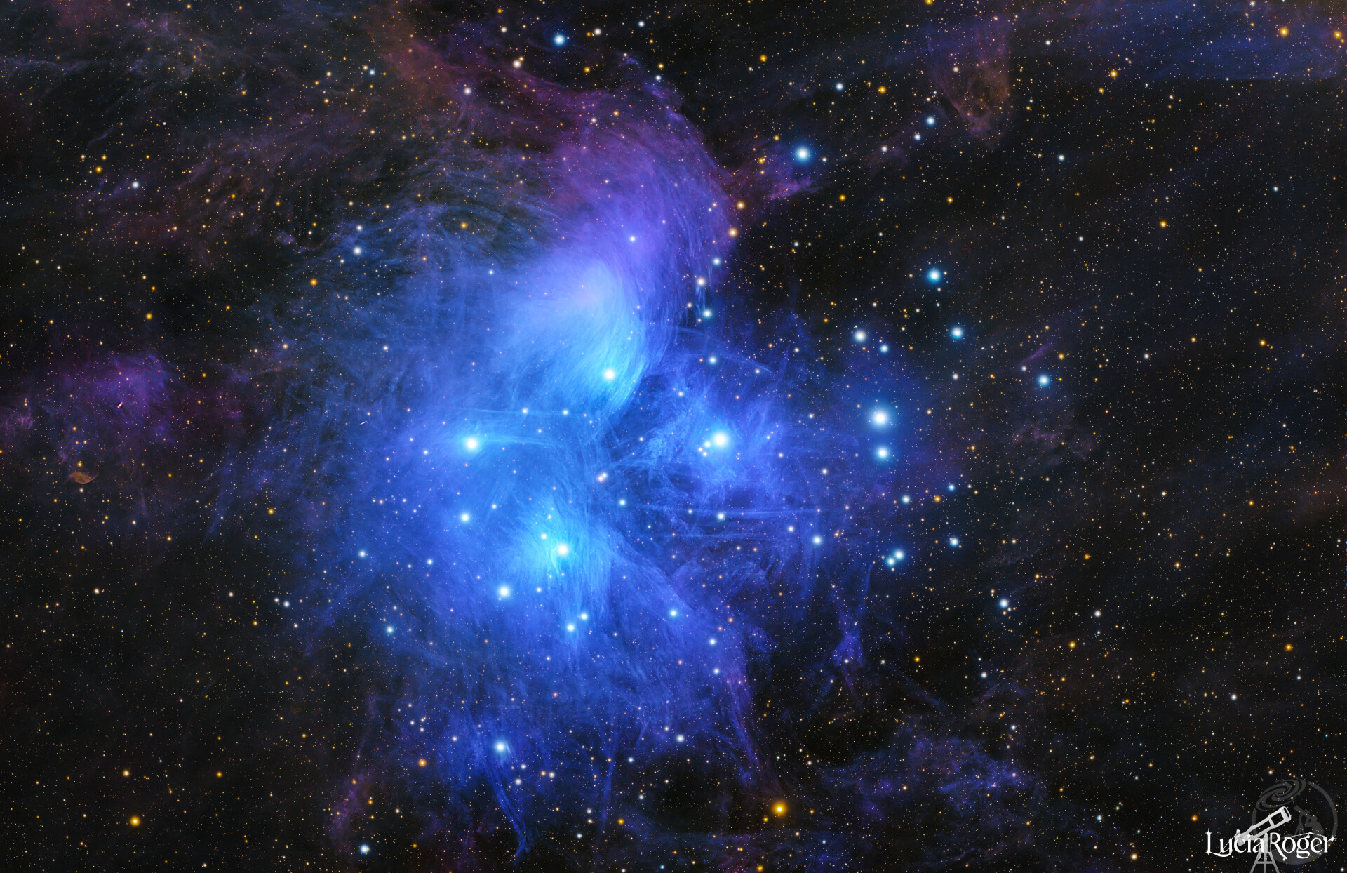M45LRGB 与第一版相比大大降低了背景拉伸的优先级,着重于保留核心的色彩。同时分离拉伸星点使星点看上去更细小,不过感觉星点略有些生硬。第二版增加了色彩饱和度和背景拉伸力度。
