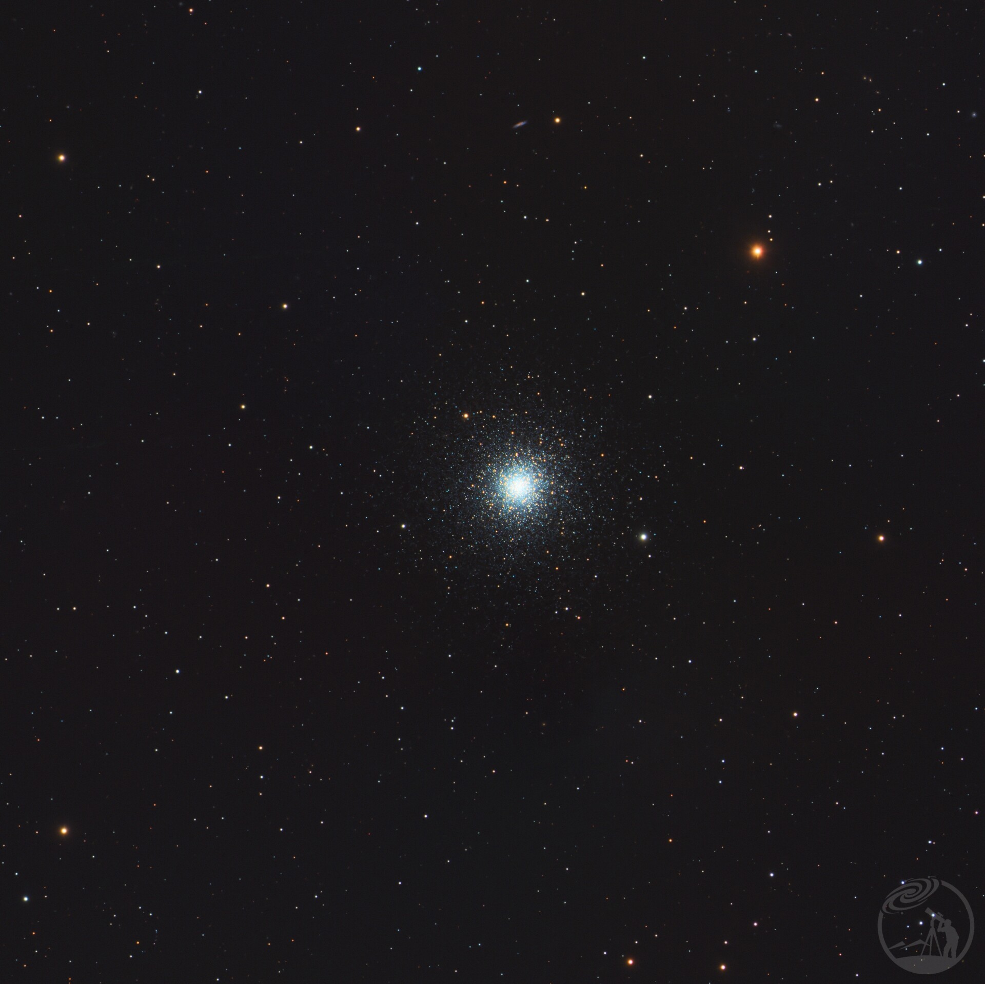 星团周围散布着数量众多的背景恒星,它们的视亮度较弱,呈现出细微的蓝色、白色或黄色,构成了深邃的夜空背景。在画面的右上方偏远处,有一颗亮度较高的橙红色恒星,其视亮度在视觉上超过了星团边缘的大部分恒星,与主体的蓝白色调形成了鲜明的冷暖对比。整幅图像客观地记录了该球状星团的空间结构及其内部恒星的多样性特征。