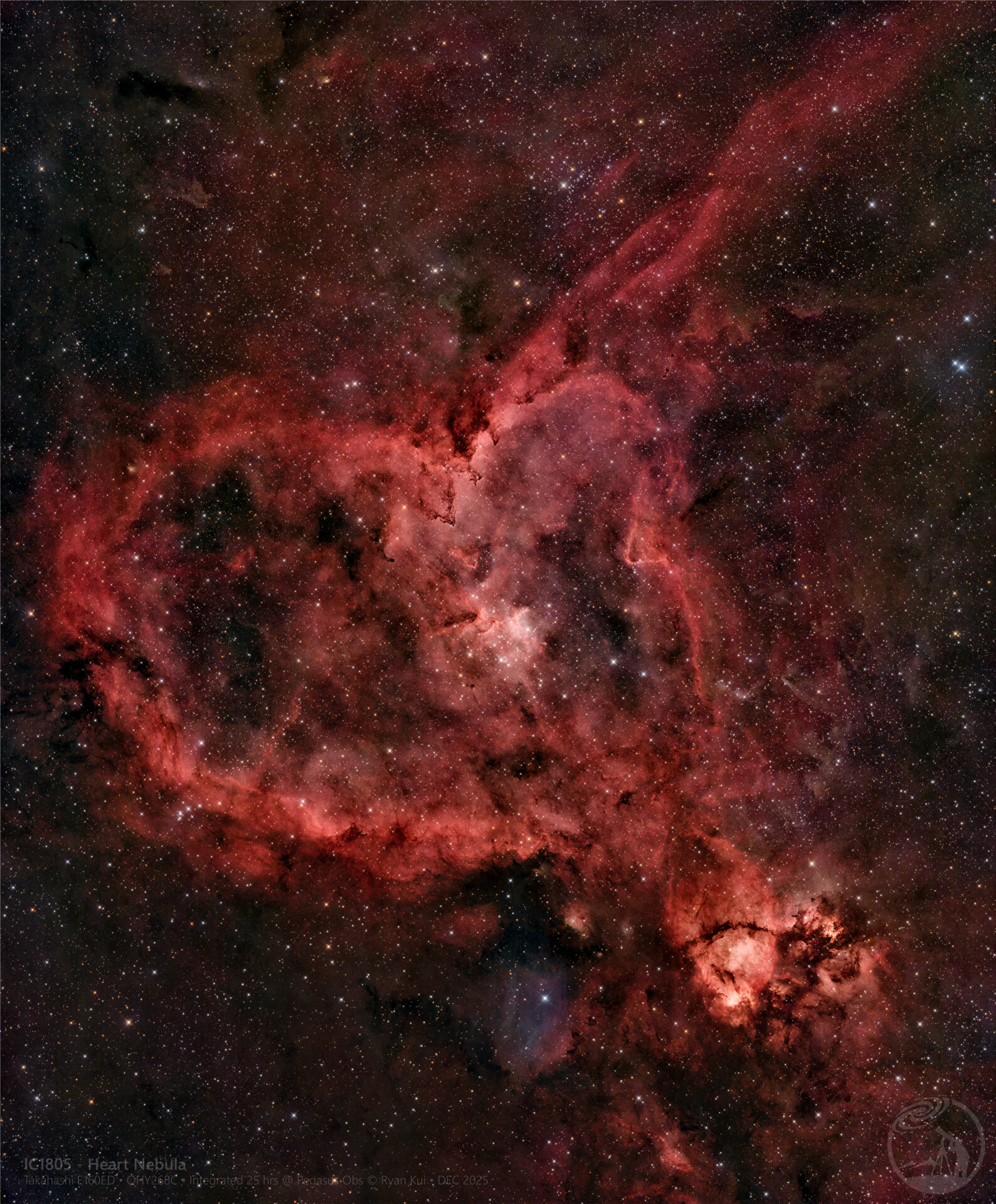 心脏星云 IC 1805 或 Sh2-190,是北半球秋冬季星空的一个极具代表性的壮丽目标。顾名思义,它在深空照片中呈现出极其逼真的人类心脏(或心形)的轮廓。它位于仙后座 (Cassiopeia),距离地球约 7,500 光年,属于银河系的英仙臂,是一个典型的发射星云。心脏星云在夜空中的实际视面积非常巨大,跨度大约有 150 角分,相当于 5 到 6 个满月的直径并排在一起。它的体型决定了它是一个绝佳的广域深空目标。在心脏星云的正中心,也就是“心室”的位置,有一个极为年轻且活跃的疏散星团,名为 Melotte 15。这个星团包含了几颗质量极大、温度极高的蓝巨星(质量可达太阳的 50 倍)。正是这些巨星发出的强烈恒星风和猛烈的紫外线辐射,不仅点亮了周围的星际气体,还将气体向外“吹”开,雕刻出了星云内部那些复杂的空洞、气柱和尘埃结。可以说,Melotte 15 就是让这颗“心脏”跳动发光的能量源泉。