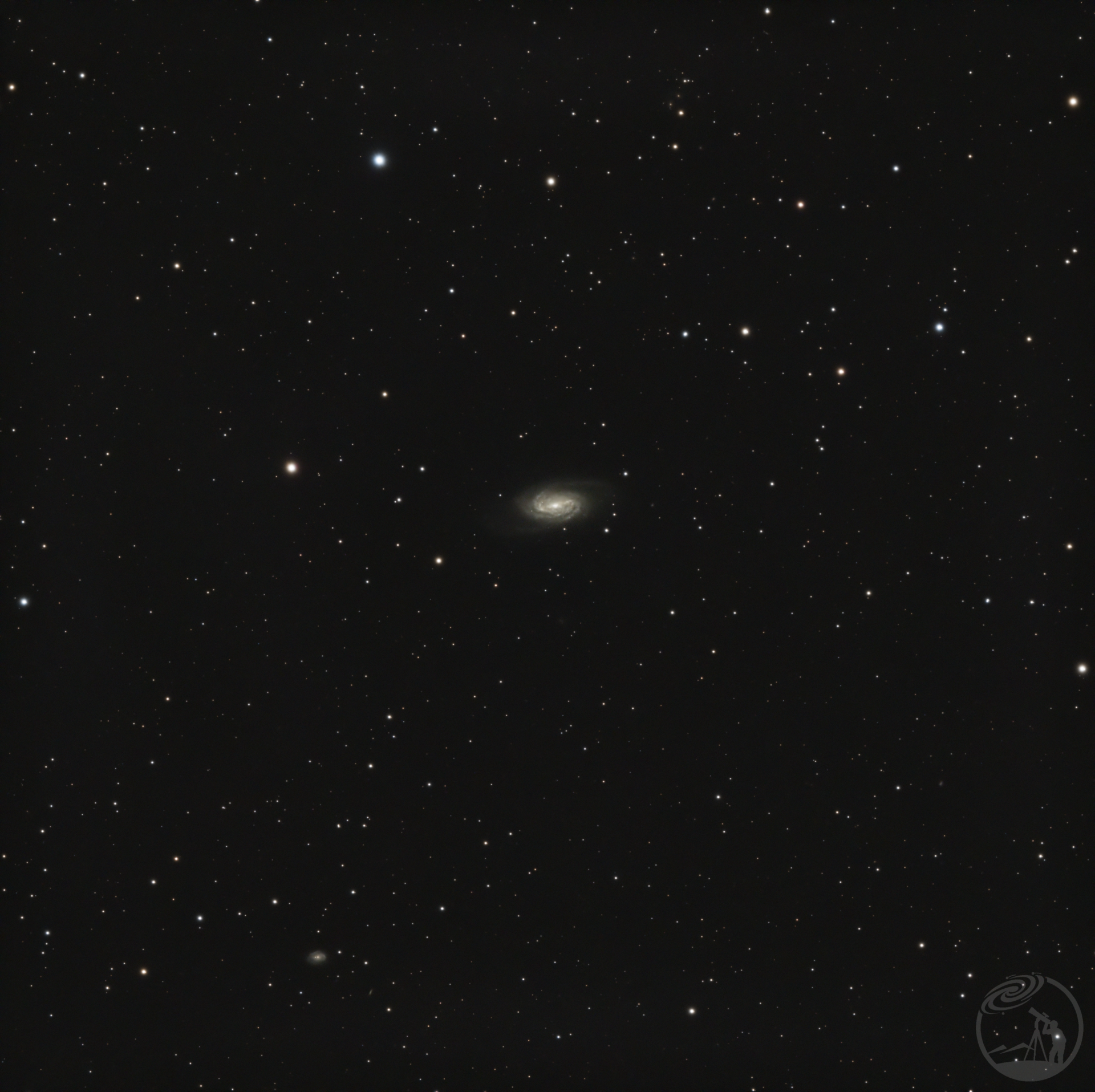 画面主体呈现的是位于狮子座方向的 NGC 2903 螺旋星系。该星系占据视野中心,其核心区域(核球)亮度最为集中,呈现出致密的黄白色光斑,显示出该处恒星的高密度聚集特征。从核心向外延伸出较为柔和且弥散的旋臂结构,环绕着核心区域,其边缘逐渐融入黑暗的宇宙背景,表现出气体与尘埃分布的广阔范围。星系的色彩以核心的暖黄白色为主,外围光晕则过渡为较暗的灰白色调,形成了清晰的中心亮度梯度。
