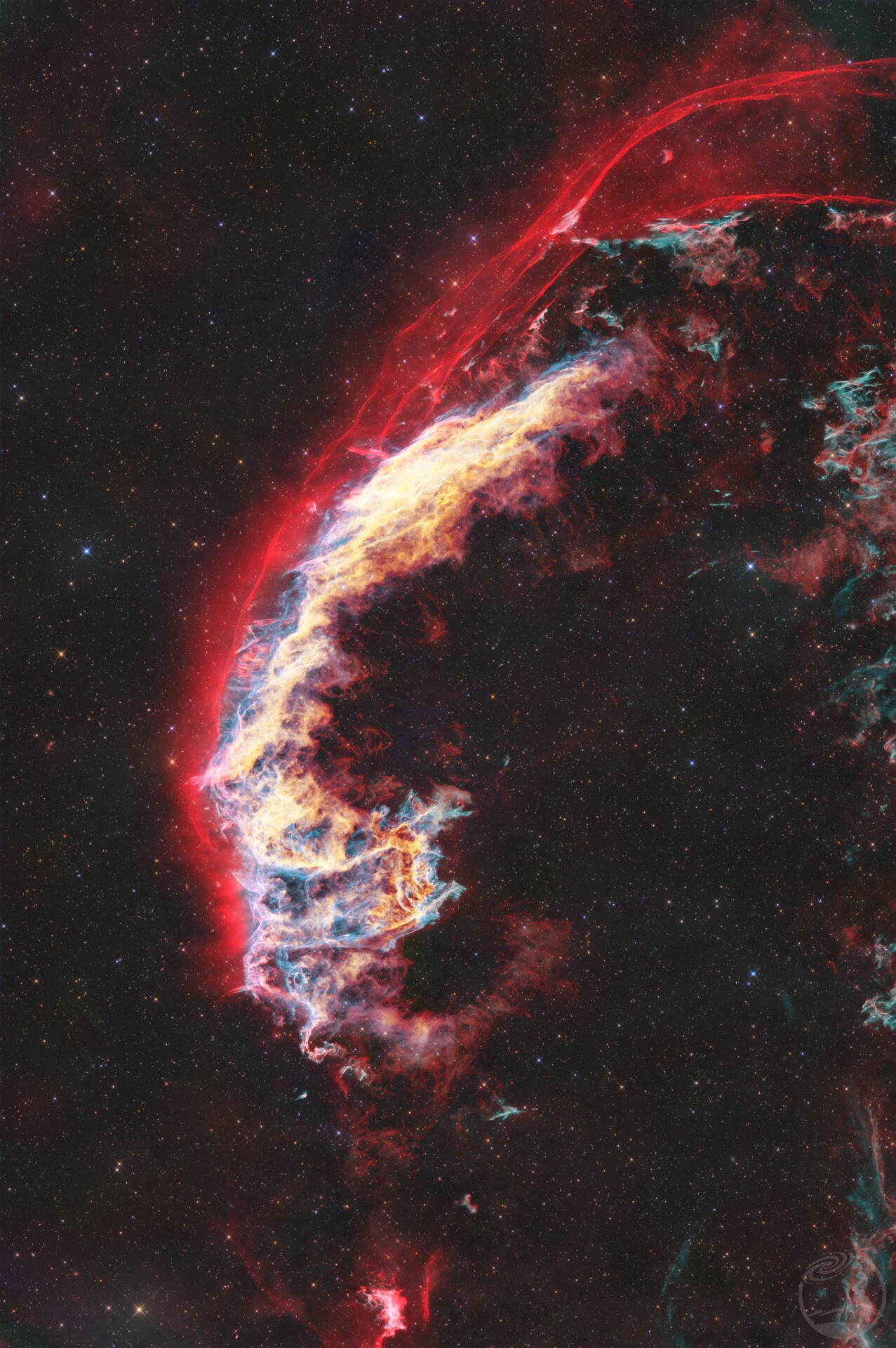 画面右侧及边缘分布着较暗的青色与淡蓝色云雾,对应于O-III谱线的辐射,显示出更高温度或激波加热区域的分布。深邃的黑色背景布满了密集的恒星背景场,这些恒星与前景的星云气体形成了鲜明的明暗对比,突显了星云极度稀薄却广阔的物理性质。整体而言,该图像清晰捕捉到了超新星遗迹撞击周围星际介质时产生的激波前沿及其引发的绚丽光谱特征。