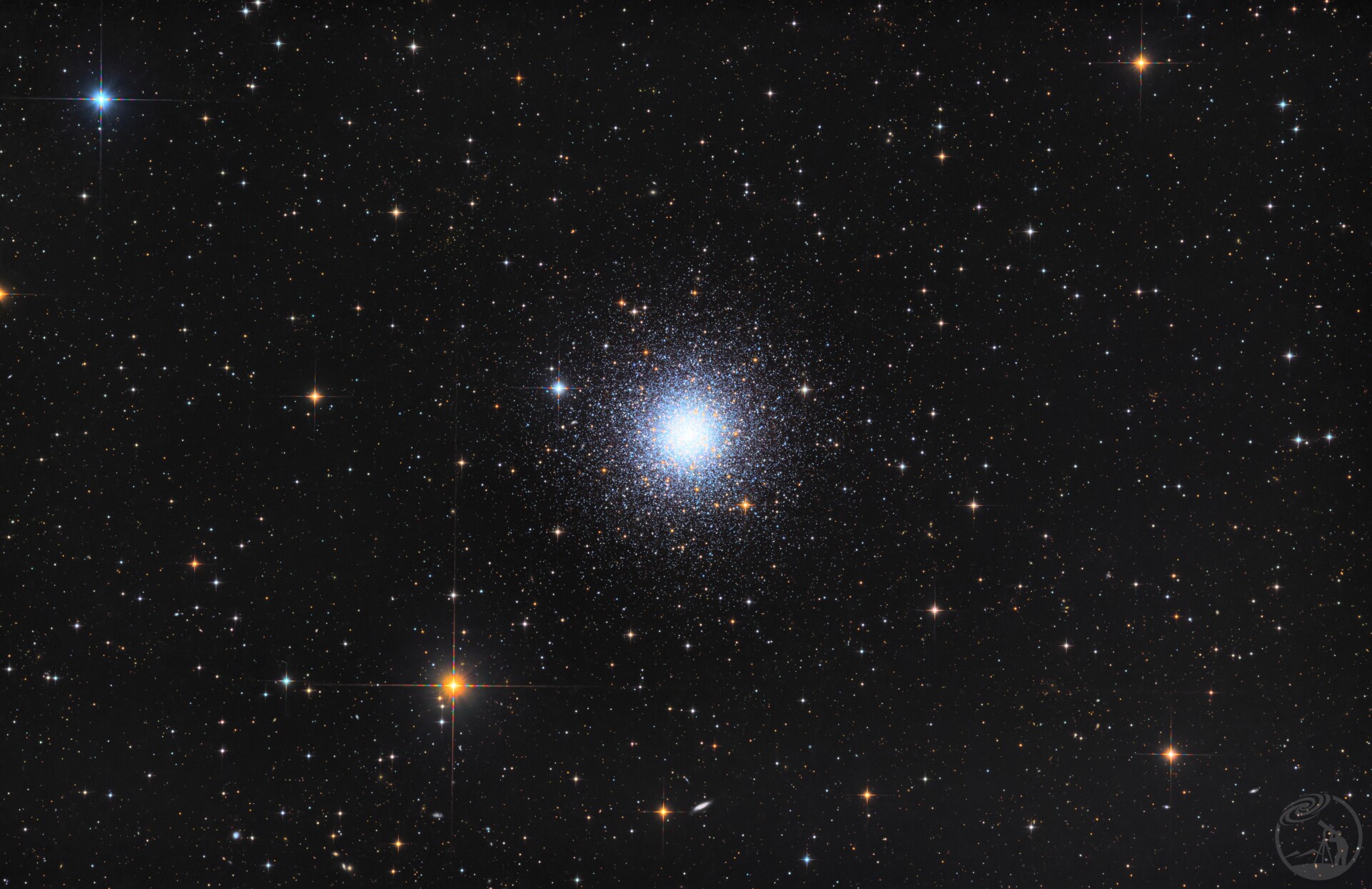 梅西耶3号(Messier 3,简称M3),编号NGC 5272,是天文学中一个位于猎犬座(Canes Venatici)的著名球状星团。它是银河系中最亮、规模最大的球状星团之一,也是最早被发现的深空天体之一。在这幅图像中,M3占据了视觉中心,展现出典型的球状星团结构。其核心区域(核球)极度密集且明亮,汇聚了大量恒星发出的强烈蓝光,形成一个耀眼的光斑。围绕核心向外,恒星密度逐渐降低,构成了清晰且平滑分布的球形光晕。在该光晕范围内,数以万计的恒星密密麻麻地排列,颜色从核心的冷蓝色逐渐过渡到外围的淡黄色甚至微红色,反映了不同演化阶段恒星的颜色差异。背景呈现深黑色,视场中散布着大量大小不一、光度各异的背景恒星,部分恒星带有明显的十字星芒。此外,在星团主体下方的暗弱区域,可以辨认出一个呈细长条状或椭圆状的微小天体,推测为背景星系,进一步丰富了天体的空间层次。整个画面清晰地记录了该古老恒星系统的引力束缚结构与丰富的恒星种群特征。