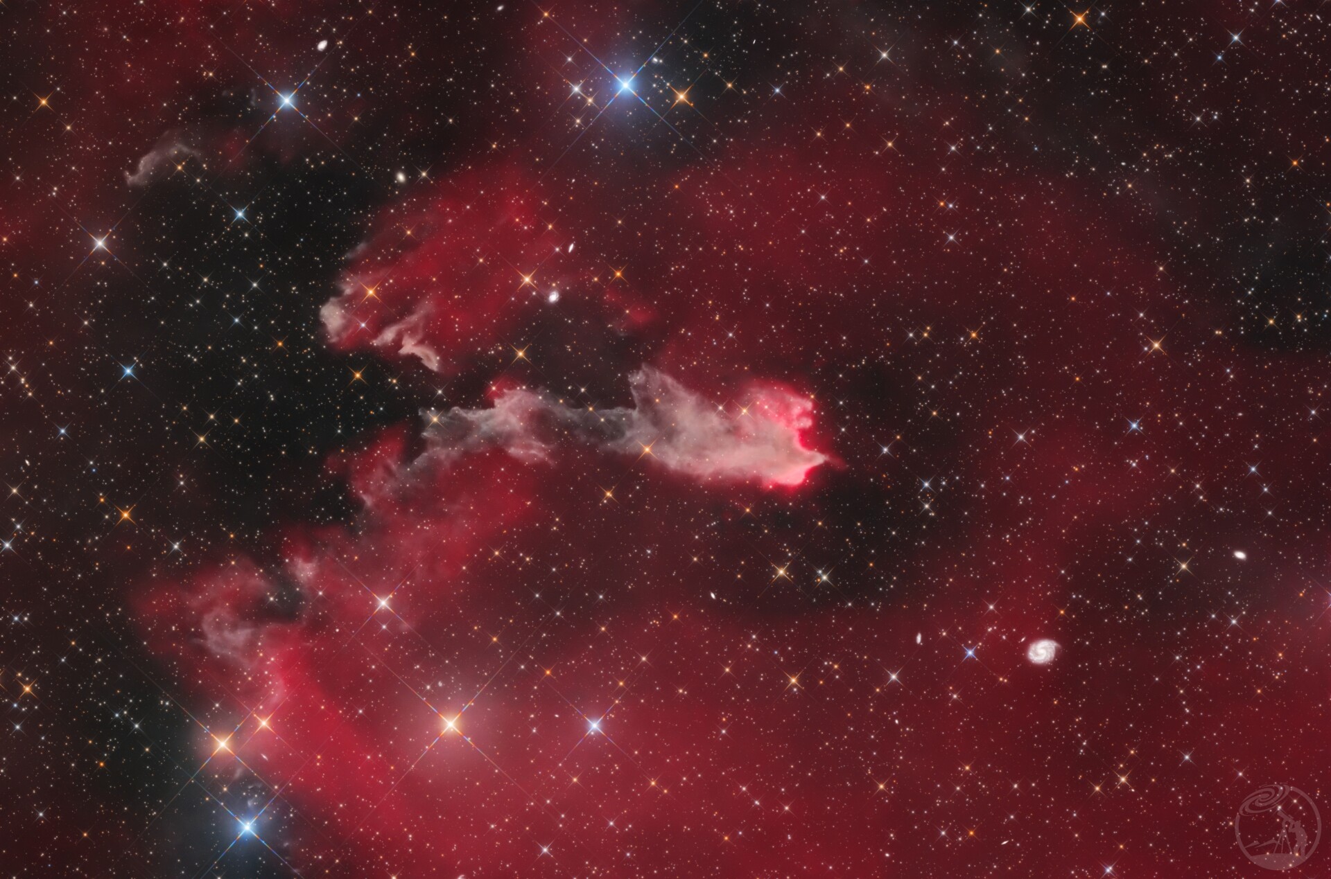 星云周围环绕微弱的氢原子辐射光晕与散落星系,增添神秘感,仿佛进行跨光年的引力对话。作为恒星形成摇篮,其密集尘埃与氢气可能在引力坍缩中孕育原恒星。观测需长时间曝光摄影,挑战性与艺术性兼具,成为深空摄影爱好者的热门目标。其形态与“上帝之手”星云CG4高度相似,被誉为“宇宙深渊的巨手”,兼具神圣与幽冥的双重意象,是研究恒星形成与暗星云演化的重要天体。