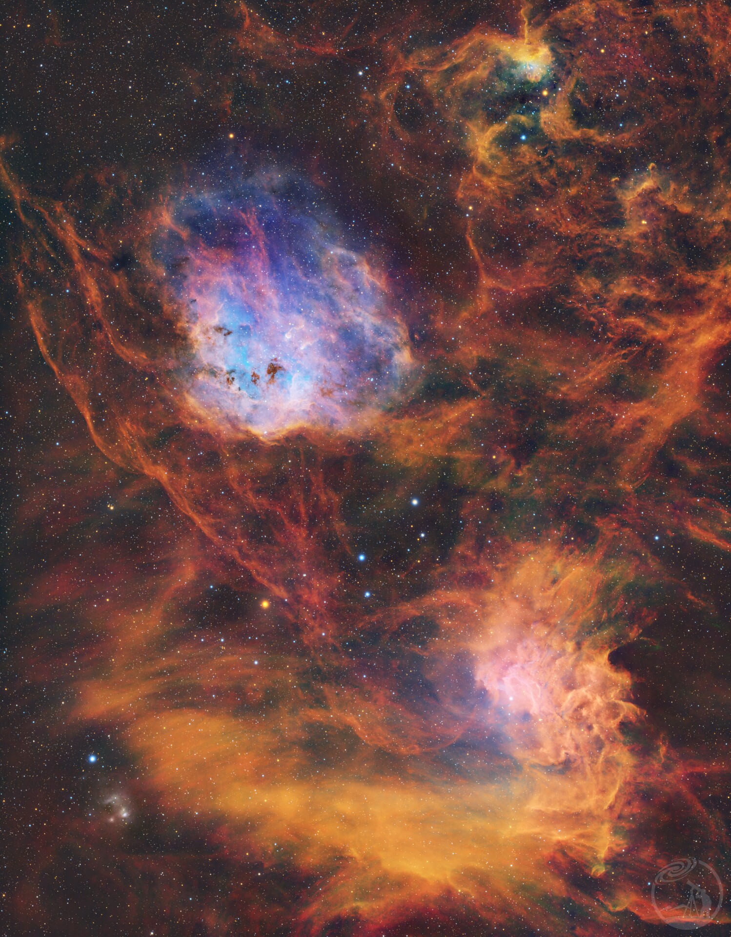 图像采用标准的窄波段合成配色方案(SHO),将硫 II 发射线、氢阿尔法发射线与氧 III 发射线分别映射为红色、绿色和蓝色通道。画面呈现出发射星云典型的光谱特征分布,硫元素辉光以深红色调显现于气体结构的边缘及高密度结块周围,构成了视觉基底的暖色层次。氢元素发射形成了星云主体的明亮脉络与延展区域,呈现出鲜明的绿色结构。氧离子分布则集中于高温电离核心或激波前沿,以蓝色调增加了画面的空间层次与色彩对比。色彩过渡自然平滑,各波段信号强度平衡,未出现明显的通道溢色或噪点异常。在结构细节方面,可见清晰的丝状组织、团块状密度差异以及电离边界,客观反映了星际介质的物理状态。整体影像准确还原了各窄带数据所记录的亮度信息,突出了观测目标区域气体的化学组成与空间分布特征。