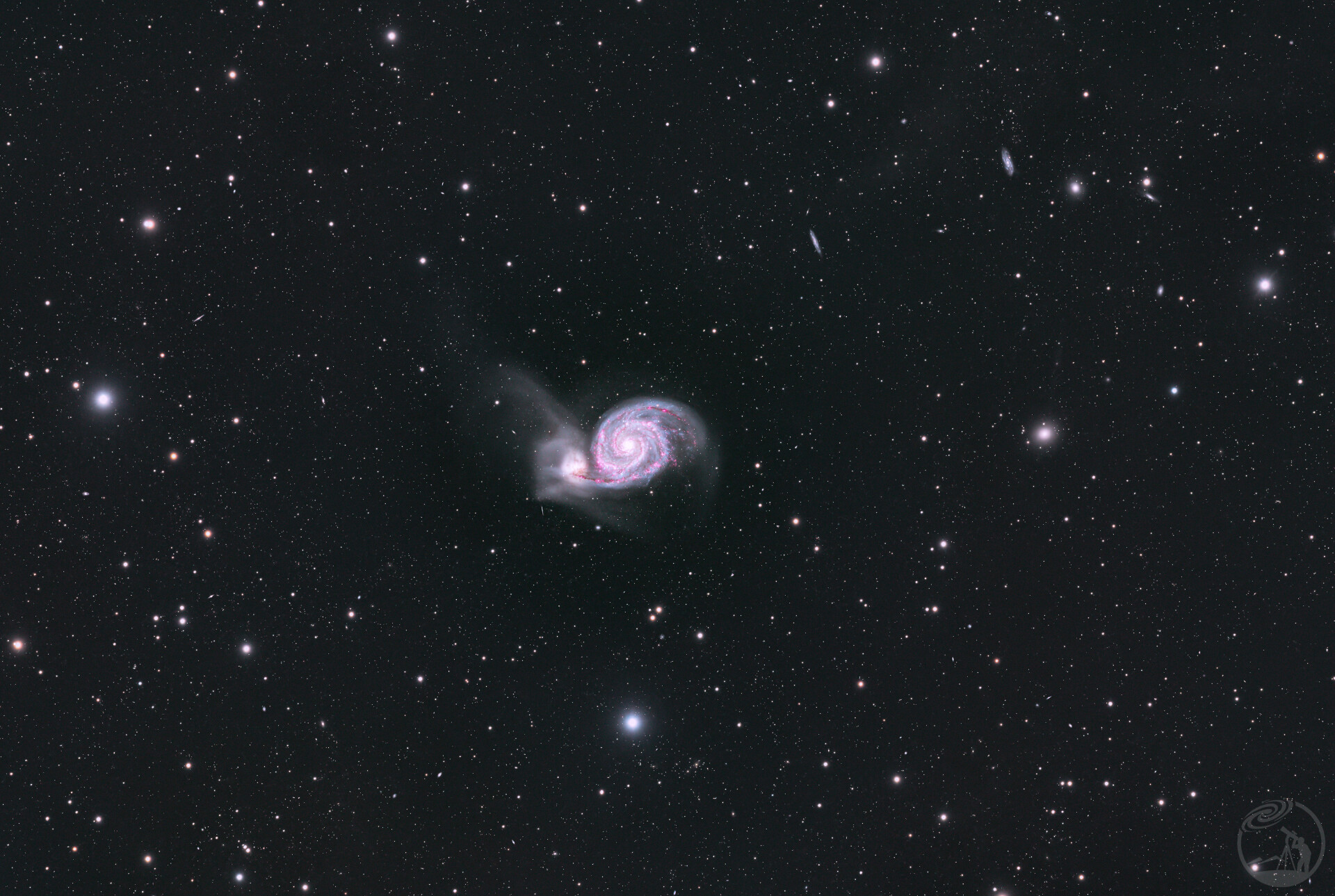 背景充满了深邃的宇宙空间,散布着大量不同亮度和颜色的前景恒星。在画面的右上方,还可以观测到几个模糊的、较小的背景星系,它们呈现出椭圆或不规则的形态,与前景明亮的恒星和巨大的M51星系形成了层次分明的深空景观。