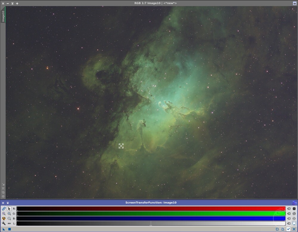 (STF预拉伸参数包括各通道的中间调平衡、阴影和高光剪切值以及动态范围扩展参数。每个视图拥有自己的STF,可以独立调整红/灰、绿和蓝的标准通道,以及一个额外的亮度 STF,仅在渲染 CIE L* 和 CIE Y* 组件时应用。Retrieved from https://astroguide.starlust.de/html/ScreenTransferFunction.html)