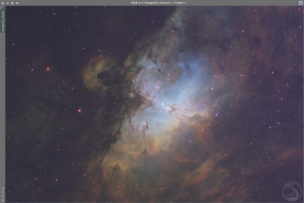 大家经常说SHO哈勃色,是因为哈勃经典的创生之柱是NASA按照SHO分别给RGB附色所呈现的(哈勃还有别的SHO图像,感兴趣的可以了解一下),SHO只是获得哈勃色的通道合成方法,并不代表SHO就一定是哈勃色,也不意味费劲做的后期一定能获得理想的哈勃色。NASA做SHO附色是为了更直观分析星云的元素分布,所以如果目标本身就缺乏SHO中的一个,那么就不要想着做出好看哈勃色了(啊当然H是几乎不可能缺乏的啦🤣)。此外,NASA是像我们平时这样处理深空素材的吗?显然不是,哈勃那个年代可没有这么多的软件去辅助我们进行调色,而且其SHO的信噪比和亮度已经非常夸张了不需要冗余的处理,因此NASA的创生之柱就是简单的校准叠加降噪,那么我们处理创生之柱时也应当尽可能遵循这个道理,上面的过程中我用的参数和力度都是非常小的。