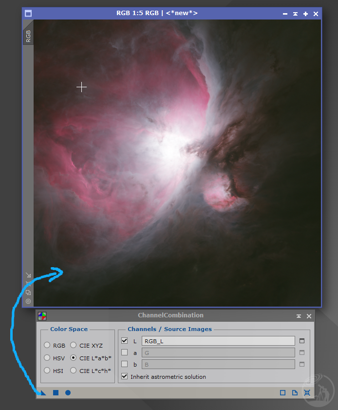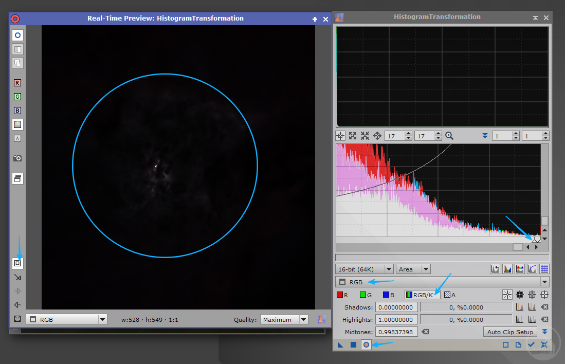 2、打开预览,选中RGB/K,将中间滑块拉至极右端,使得M42只剩暗淡的核心(这步非常重要);