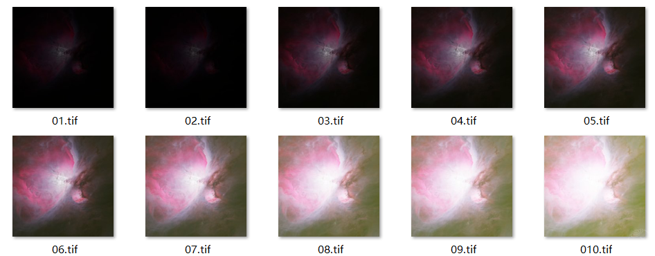 5、最终得到一系列曝光程度不同的图。这里做了10张,数量可多可少,显示不同曝光下的梯度,且必须包含暗淡核心和暗云气可见(核心过曝没事)的两张图;