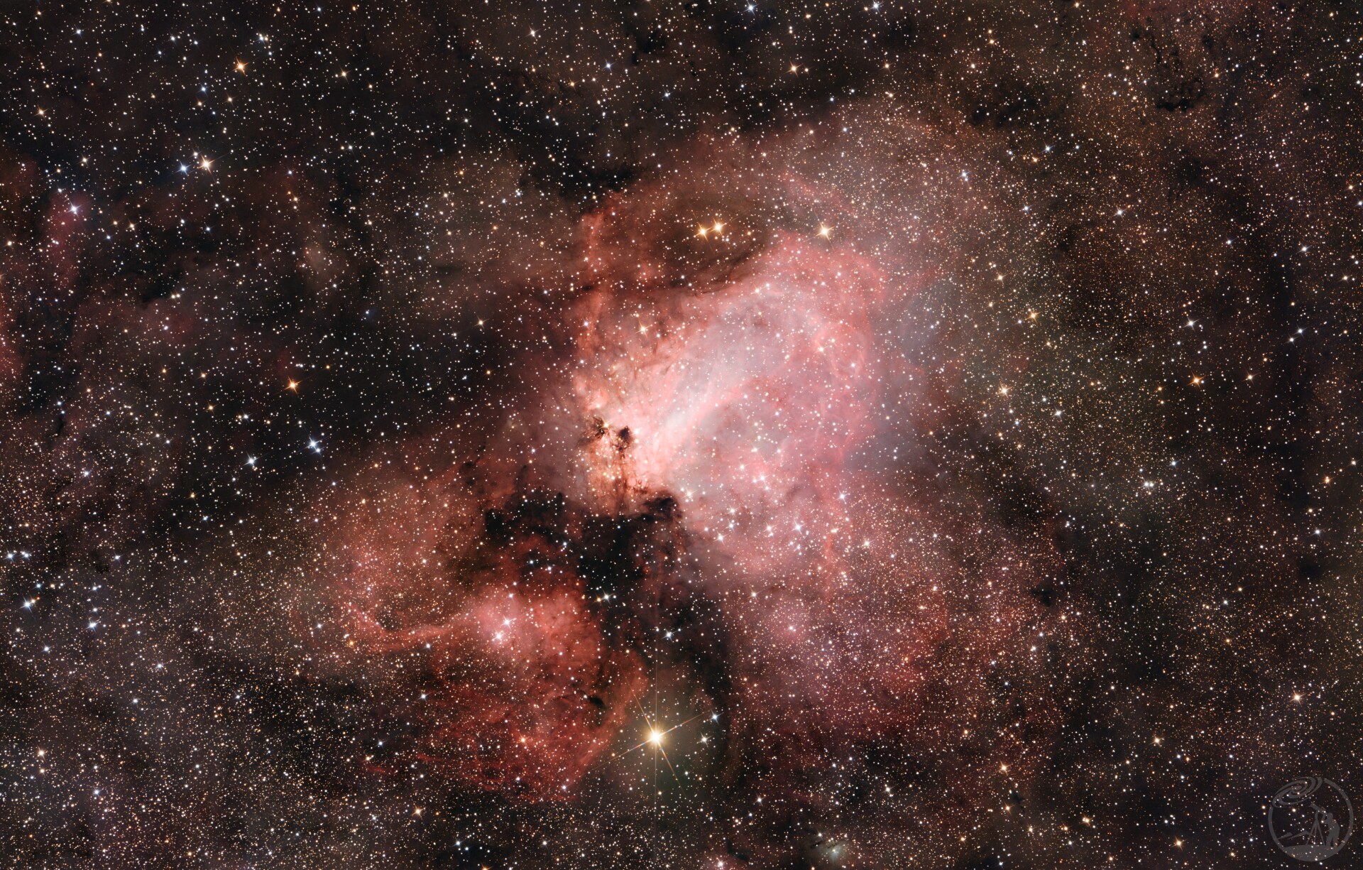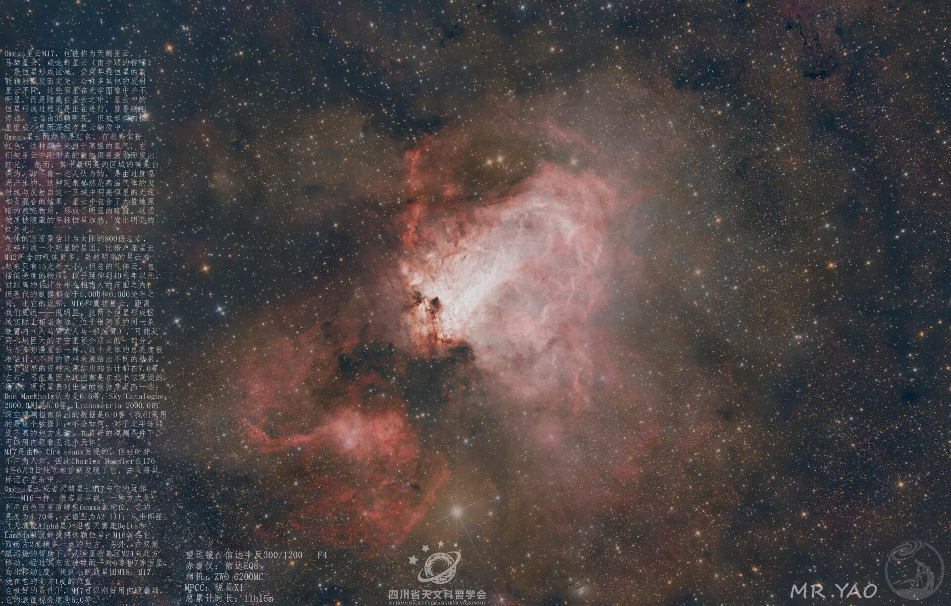 Omega星云M17,也被称为天鹅星云,马蹄星云,或龙虾星云(南半球的称呼),是恒星形成区域,受到年轻恒星的高能辐射激发而发光。与许多其他的发射星云不同,这些恒星在光学图像中并不明显,而是隐藏在星云之中。星云中的恒星形成过程不是正在进行,就是刚刚停止。一个由35颗明亮,但被遮挡的恒星组成小星团深埋在星云物质中。