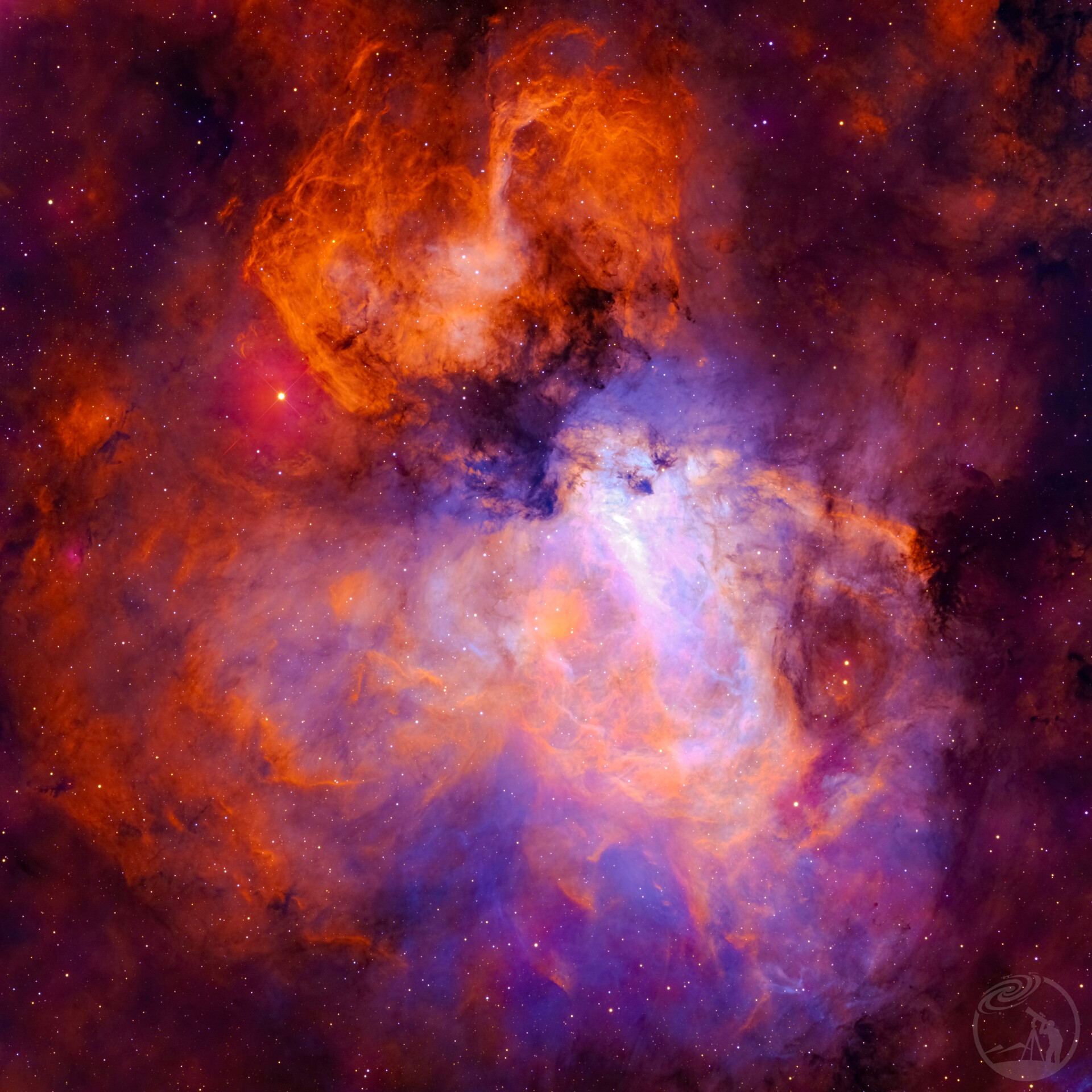 M17,又称欧米茄星云或天鹅星云,位于人马座,距离地球约5500光年。它是一个明亮的发射星云和电离氢区,也是银河系中最活跃、最庞大的恒星形成区之一。其内部藏有一个仅百万年历史的年轻星团,星团发出的辐射使其气体发出璀璨红光。