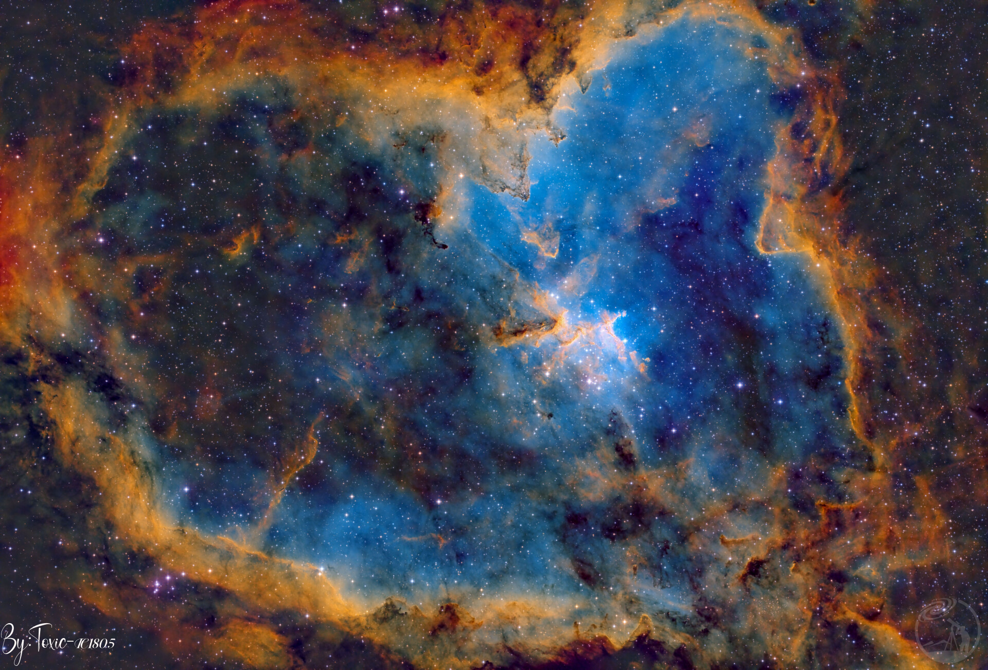 IC1805心脏星云位于仙后座,距离地球大约 7500 光年,是一片由年轻恒星激发的巨大电离氢气区域。星云中央的 Melotte 15 星团中聚集着大量高能恒星,它们的辐射和恒星风不断塑造出周围那复杂而壮观的结构。