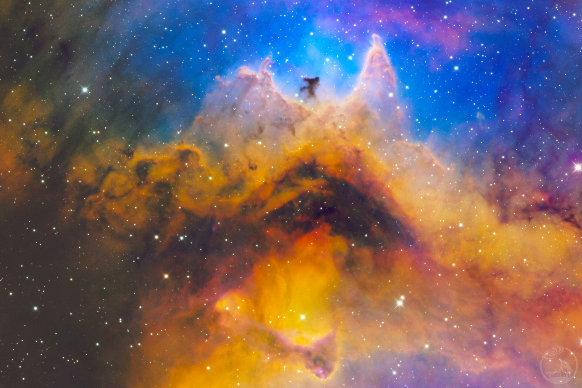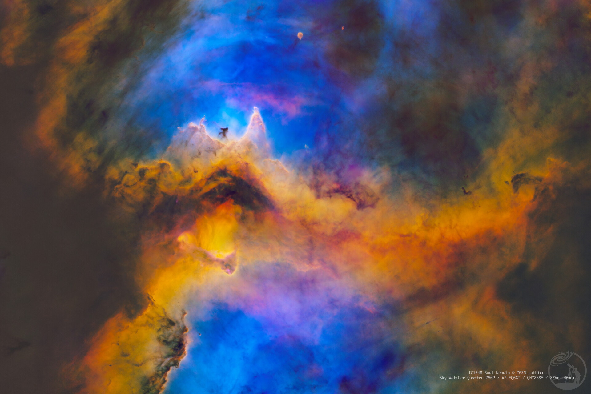 灵魂星云(IC1848、Sharpless 2-199、LBN 667),是一个位于仙后座的发射星云,一般认为距离地球在6000~7500光年之间。采用SHORGB六个通道拍摄约28小时,其中星云主体使用SHO调色,配以RGB星点。