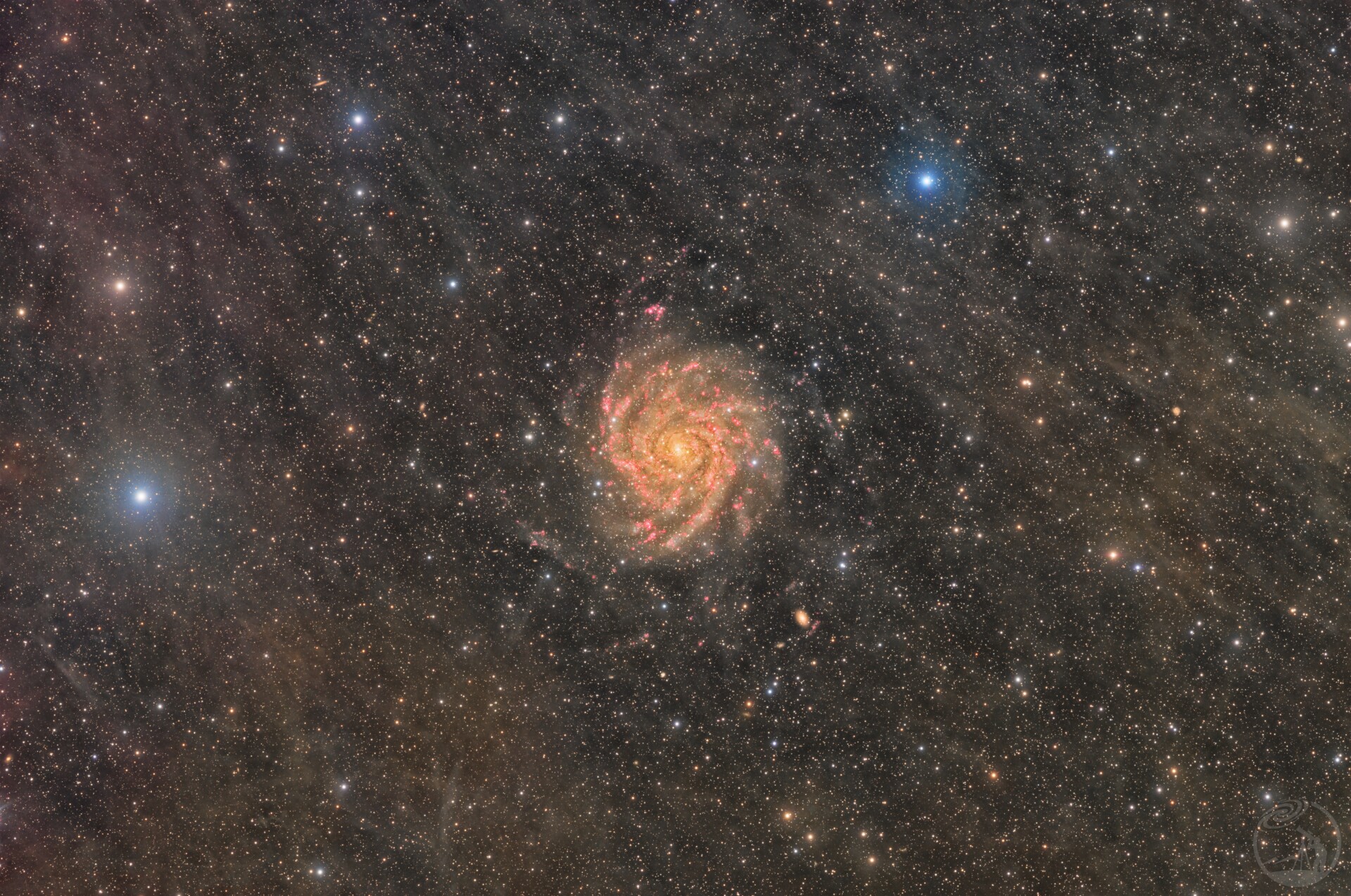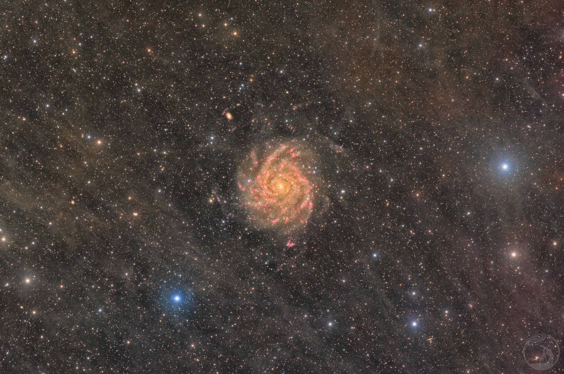 隐藏在银河系核心尘埃和IFN下的星系,故而得名隐藏大星系。不同于一般的螺旋星系的蓝色,由于尘埃遮挡IC342整体呈橙黄色。不过因为盘面正对地球,可以解构其壮观的结构和发射氢区。