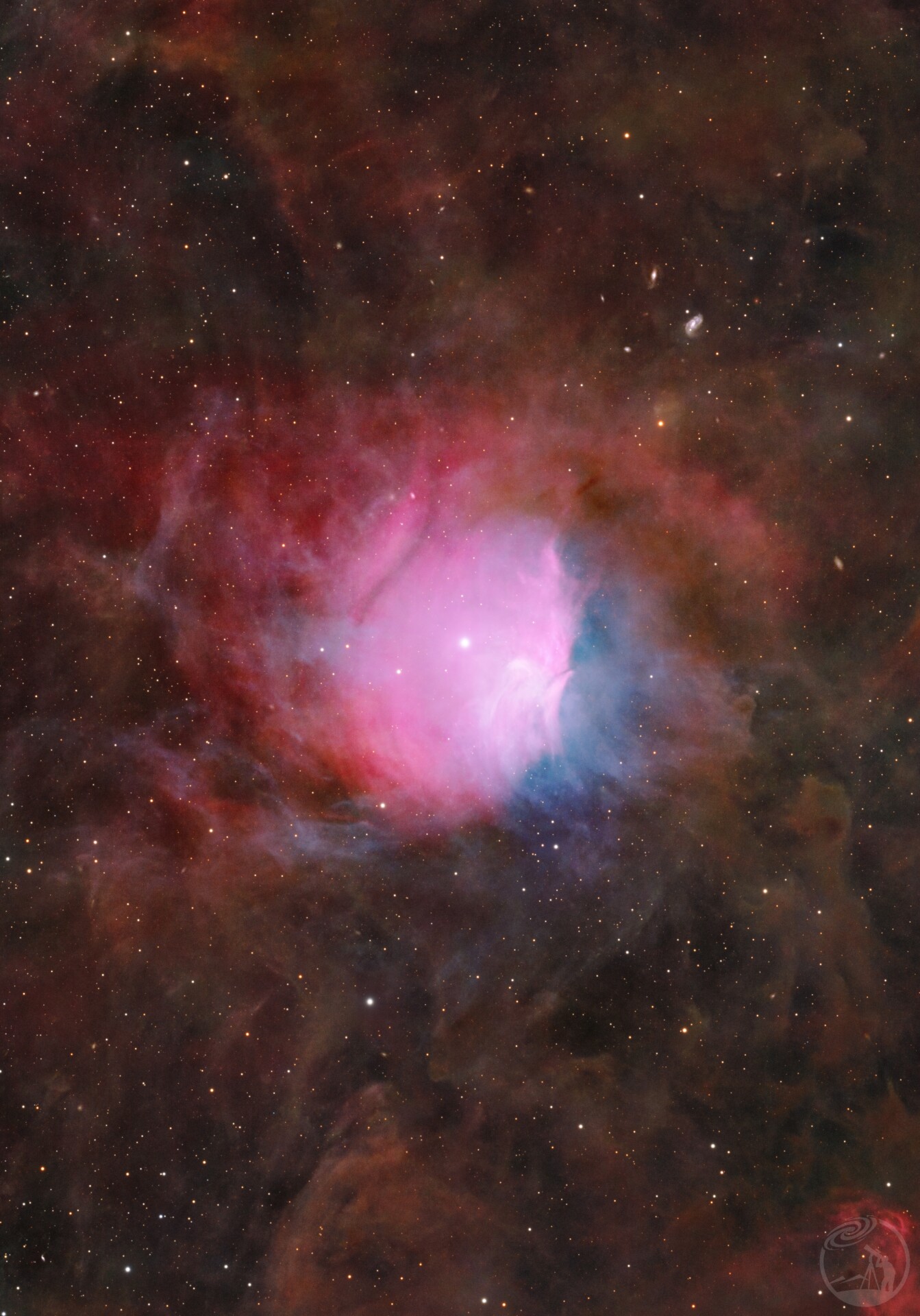 在长时间曝光的深空照片中呈现为一个形状不规则的、弥漫的红色气云。它的核心部分相对较亮,周围有较暗的纤维状和云气状结构向外延伸。