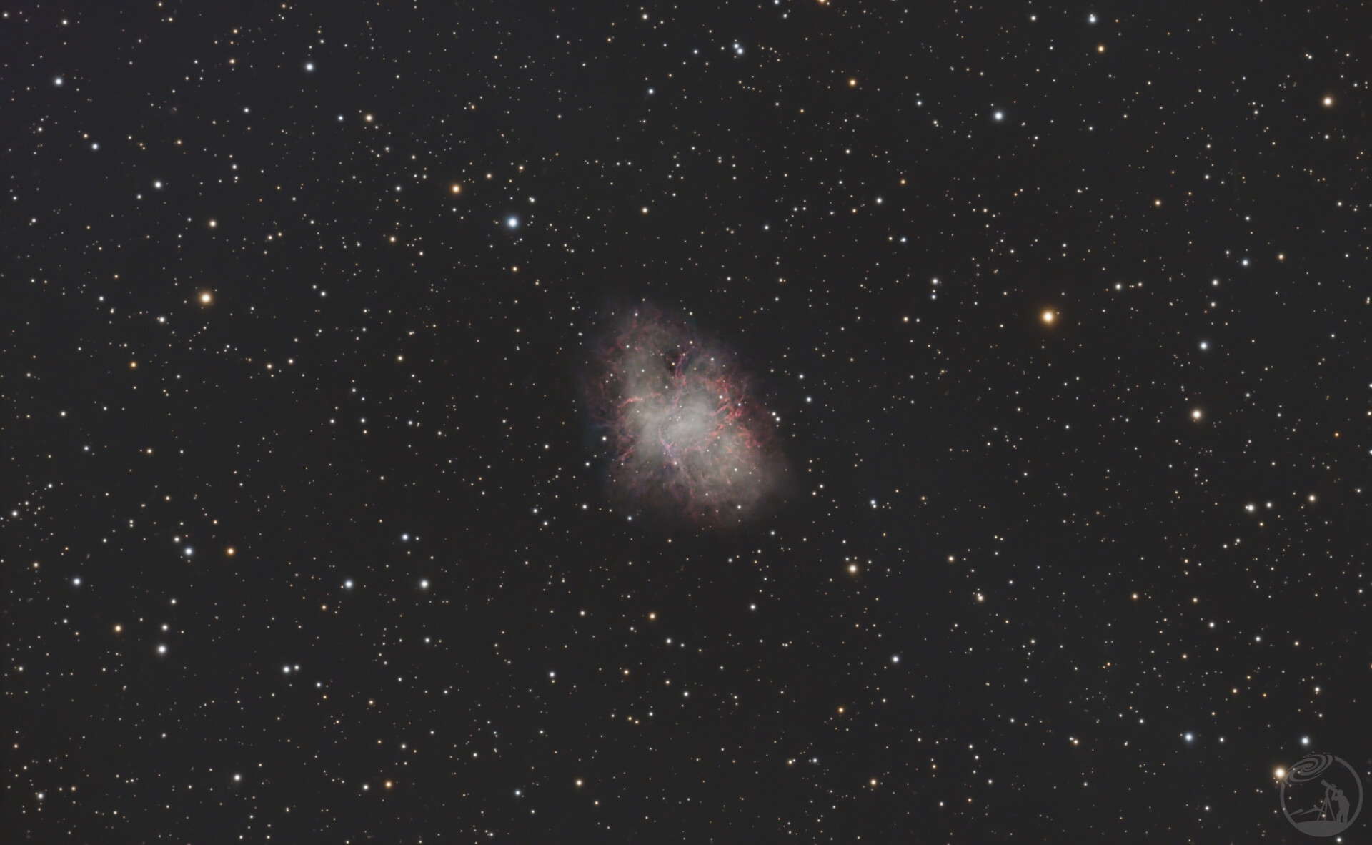 没用滤镜拍摄的蟹状星云,上次发的后期的颜色有问题,这次重新处理了好看点了。蟹状星云(Crab Nebula,编号M1、NGC 1952)是金牛座ζ星东北面的超新星遗迹与脉冲风星云,距地球约6500±1600光年