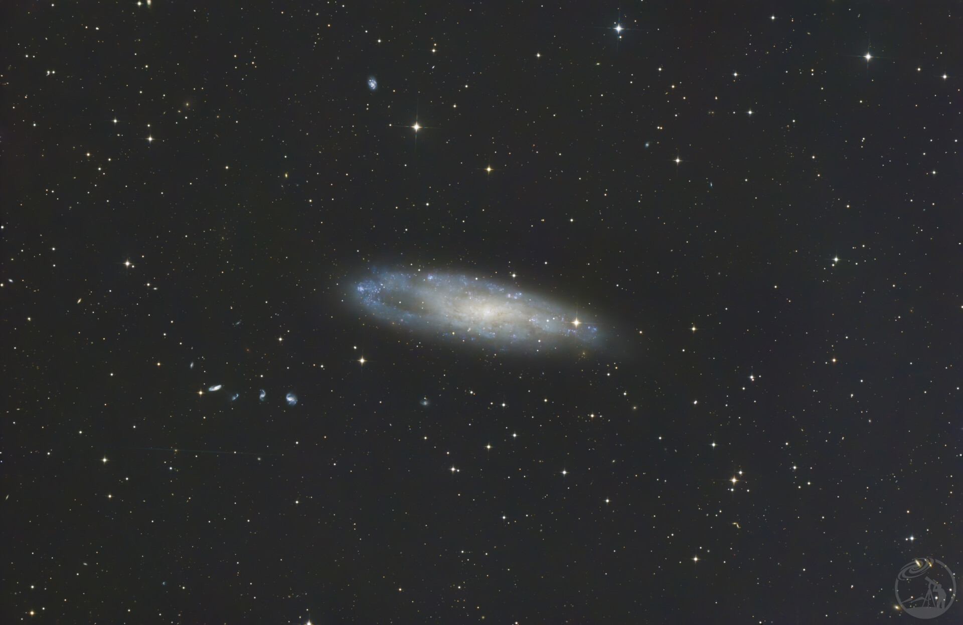 NGC247是一个直径约为70000光年的旋涡星系,比银河系要小。根据测量,它距离我们仅有1100万光年。从地球上看去,NGC247几乎是侧面朝向我们。这张照片中的主体就是NGC247,位于南天的鲸鱼座。星系盘的一侧有个明显的空洞,使它获得了“针眼星系”的别称。在这张清晰的星系照片中还可以看到很多的背景星系,尤其是左下侧有4个星系排成一列,被称为Burbidge星系链,这几个星系距离我们约3亿光年。NGC 247以及较明亮的旋涡状的NGC253都属于玉夫座星系群。