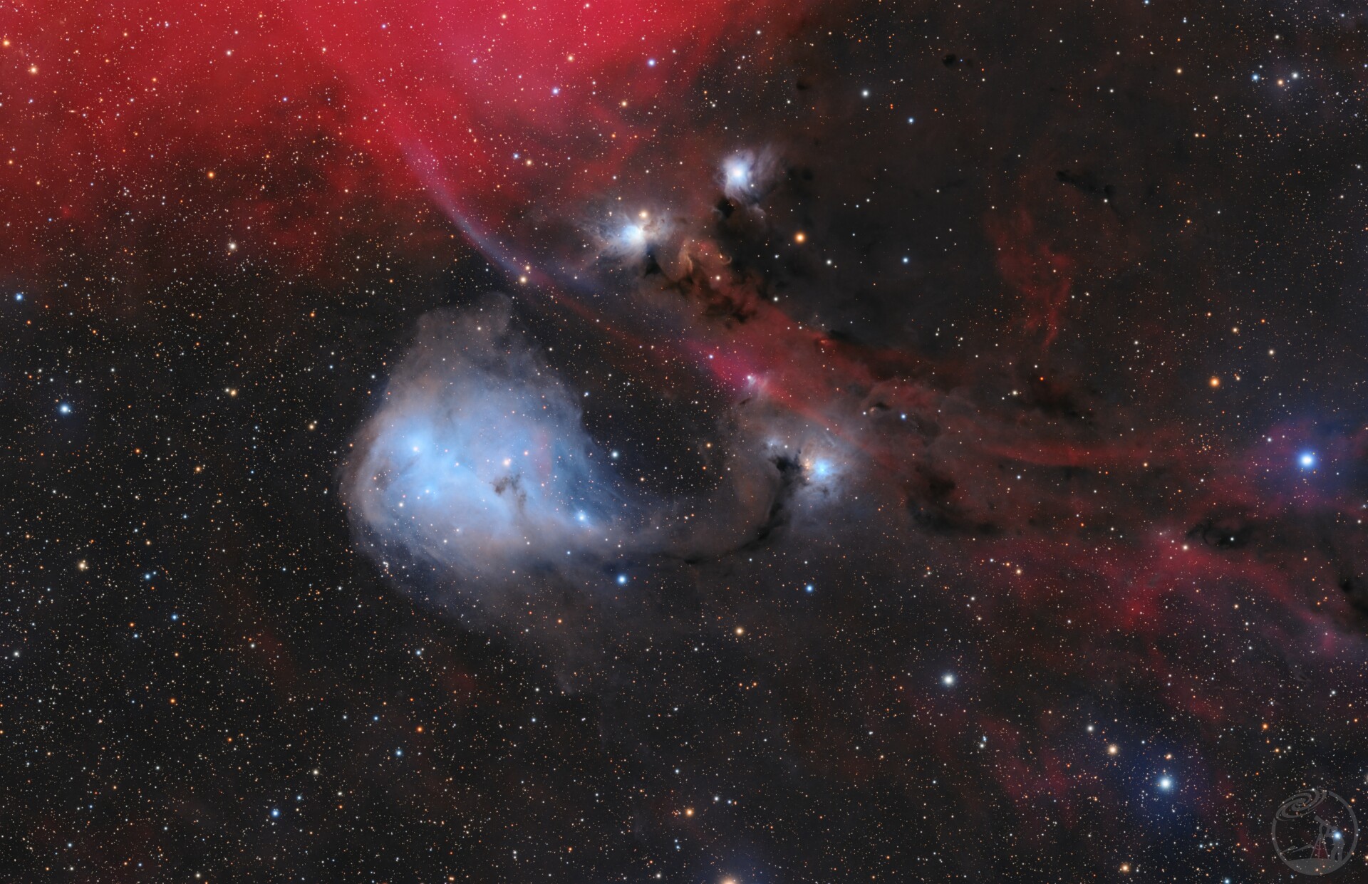 宇宙中遨游在一片Ha的海洋里的小蓝鲸,其中有一条不太明显的O丝带结构,可谓是点睛之笔。为了避免暗部H加的正好导致那一大团的Ha结构被破坏,且避免过饱和炸眼,所以添加HO比较保守,使得结构尽可能被保留下来。