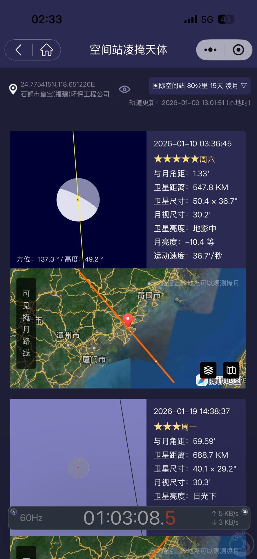 因为视宁天气都不错,放弃了木星冲日当晚拍木星的计划,两场occ完直接进行100km机动转场拍ISS,就想看看好视宁下的凌月以及测试下16位拍摄(结果会掉帧)。这次拍到了视觉上最小个头的空间站姿态。
