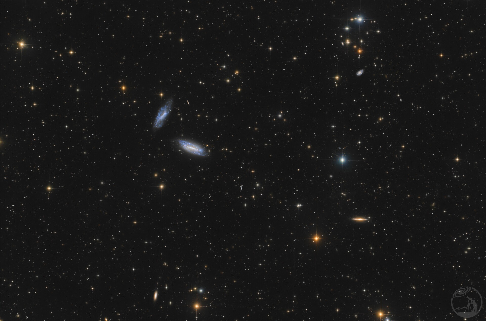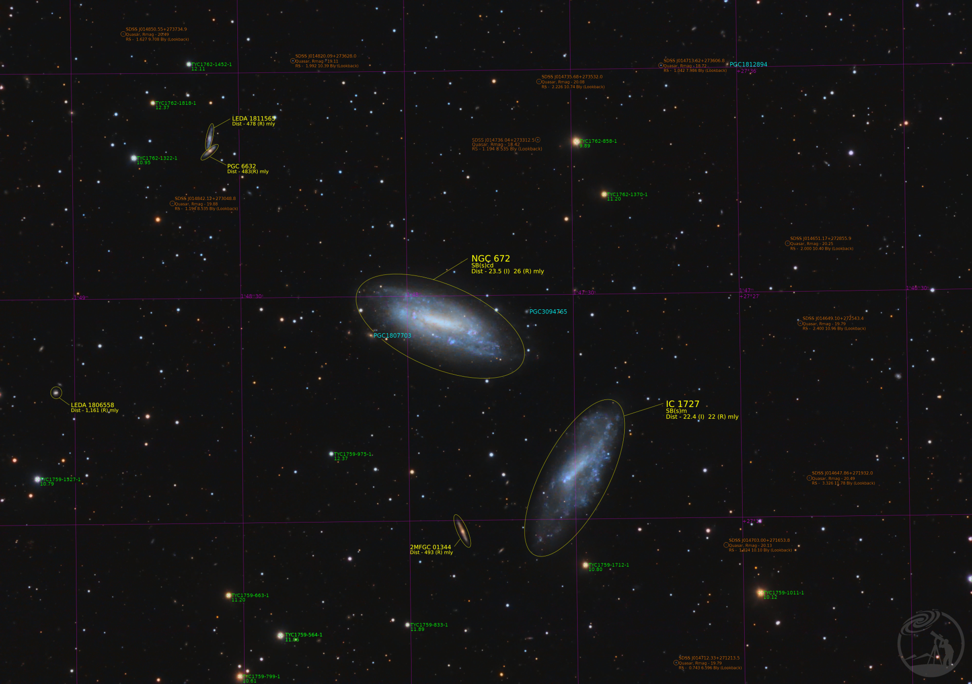 这张图片显示了一对螺旋星系,NGC 672 和 IC 1727。上方的星系是 NGC 672 - SB(s)cd;下方的是 IC 1727 - SB(s)m —— 一个带状麦哲伦型螺旋星系。根据红移和图利-费舍尔法,两者的距离估计相差不大——约为 2200 万到 2600 万光年。