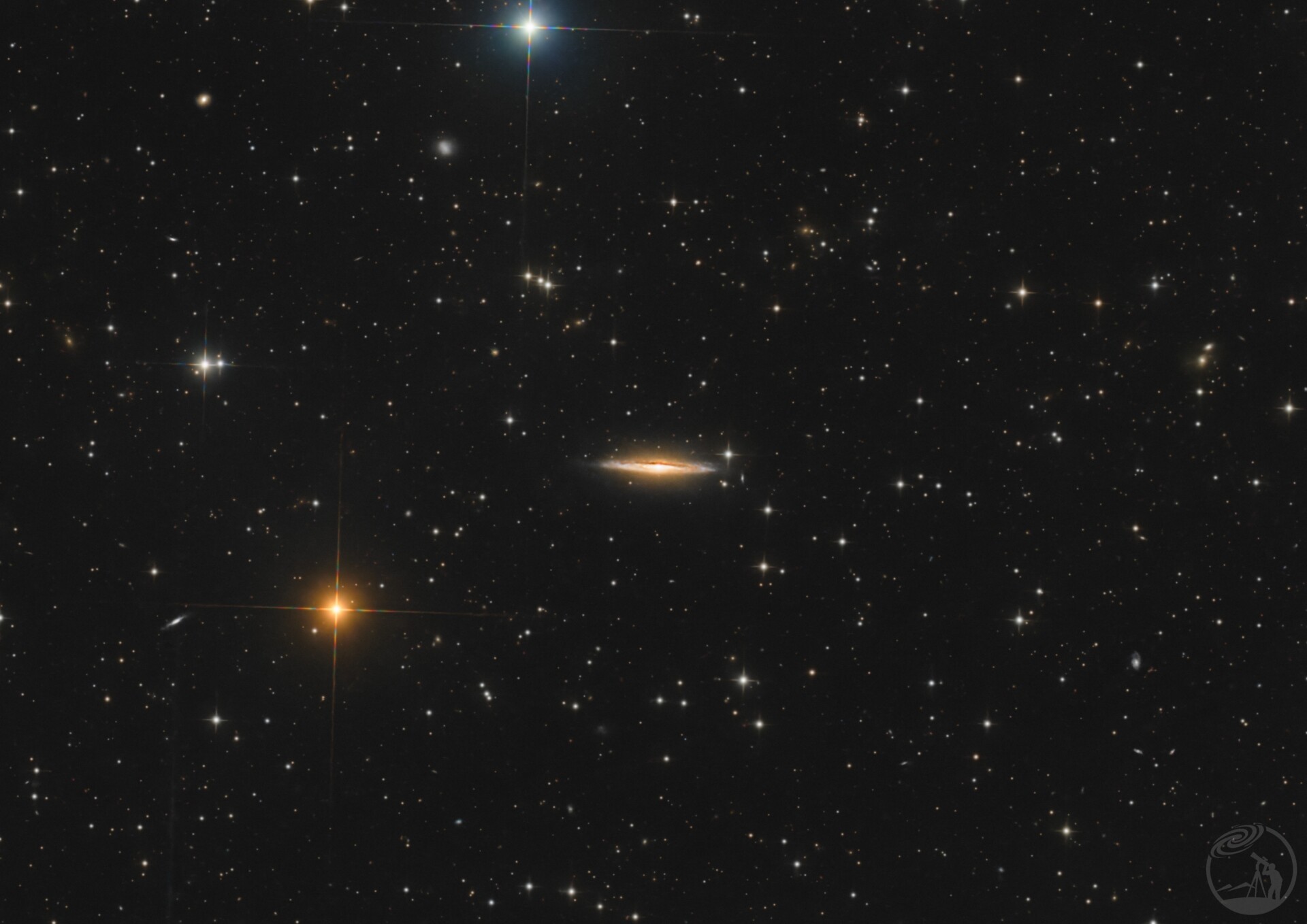 图中有三个非常明显的侧视星系(LEDA 181156、PGC 6632 和 2MFGC 01344),它们的红移距离估计约为 4.8 亿光年。LEDA 1806558 星系也出现在该视场中,距离更远,约为 11.61 亿光年。在全尺寸图片中可以看到许多背景星系。最远的天体是类星体,它们的距离(回溯时间)范围为 65.9 亿到 117.8 亿年。这些天体、相关信息、背景星系以及一些较亮的恒星在注释图中都有标出。