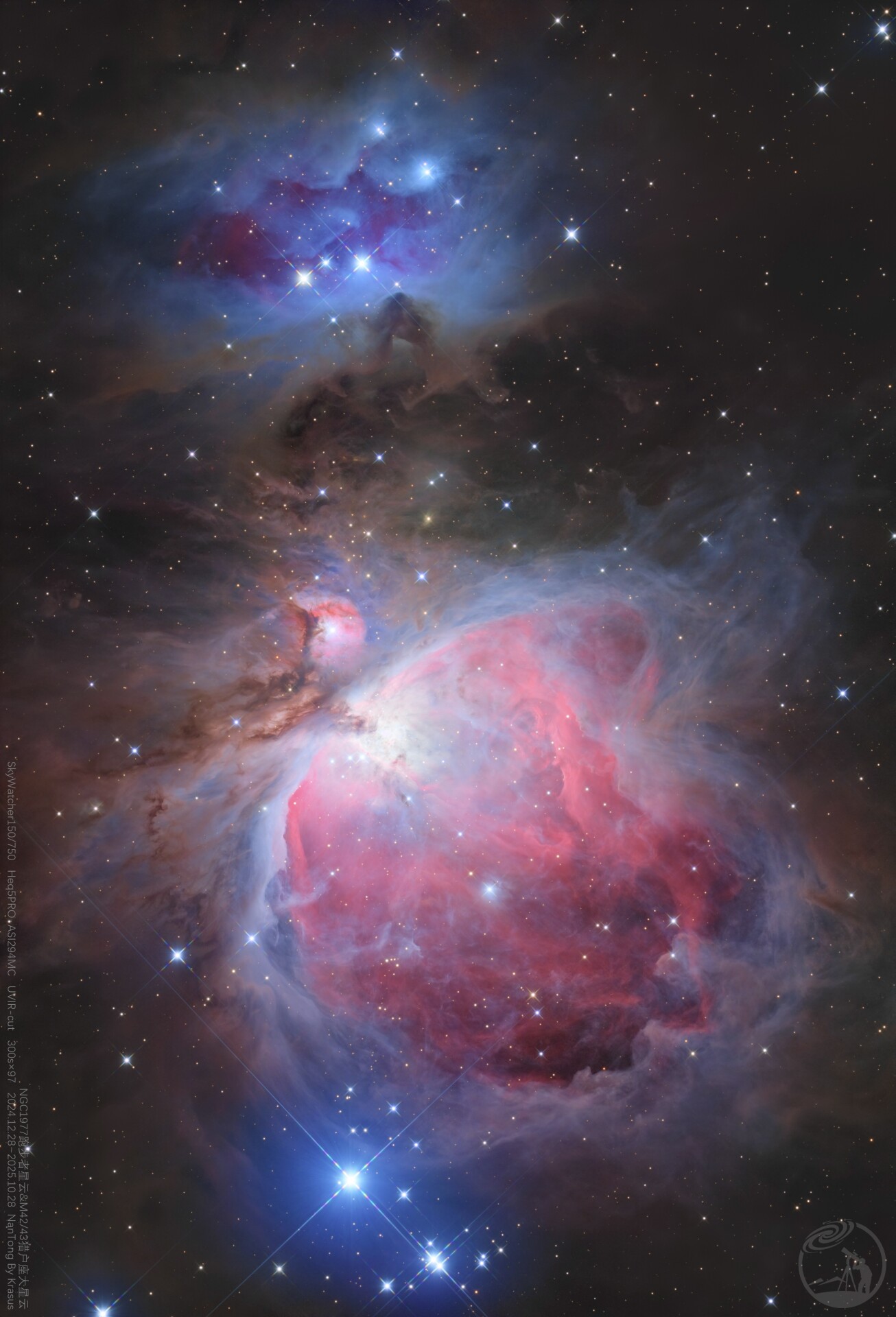 25年年底加钟到150张。本来想继续加到200的,不过处理了一下相比97张提升不大,主要暗部加了一滴滴。打野时间宝贵,让给其他目标吧。42 45 31入门三宝各个很亮,后期真一个都不容易,感觉42又是其实最难的一个。没有特意单独缩短曝光拍核心,所以HDR悄悄做了一些。个人感觉业余拍摄不是科研,一味为了细节强压HDR反而破坏了原有明暗比,42的核心肉眼可见是非常明亮的。最后再次感叹猎户座星云真的太美了!
