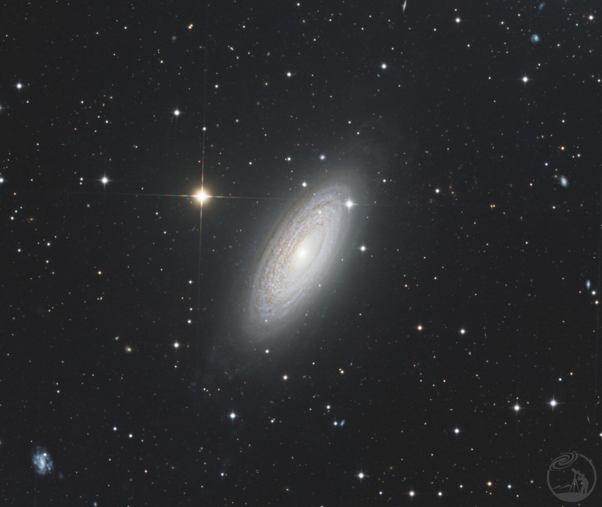 在地球的夜空中,朝着大熊座的北部星空望去,可以找到一个距离我们只有4600万光年远的漩涡星系NGC 2841。图片展示了NGC 2841的明亮核心,以及围绕着它的倾斜的星系盘和暗淡的外部区域。尘埃带、小恒星形成区域和年轻的星团镶嵌在参差不齐又紧密缠绕的螺旋臂中。相比之下,许多其他的螺旋星系通常具有更雄伟广延螺旋臂,并且在旋臂上点缀着大型恒星形成区域。NGC 2841的直径超过15万光年,比我们自己的银河系还要大。X射线图像表明,巨星和恒星爆炸产生的极端出流把许多热气体羽流喷到NGC2841星系外晕中。